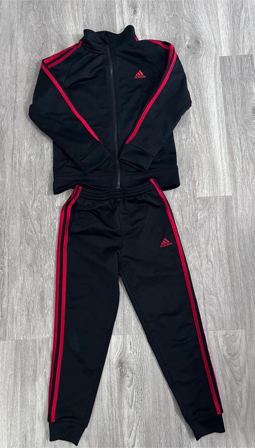 Selling an Adidas tracksuit in size 7! It's black with red stripes. Perfect for active kids or just lounging around. It's in great condition and ready for a new home!