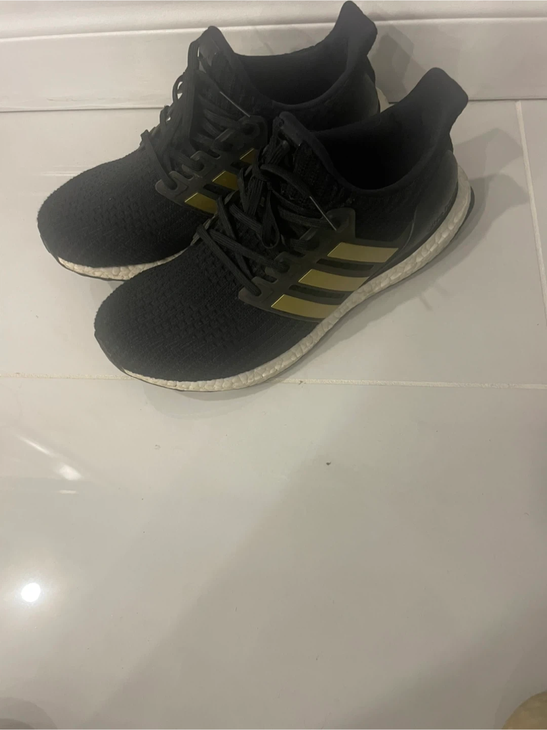 Selling a pair of Adidas Ultra Boost sneakers in black with gold stripes! They're in good used condition with some wear on the soles, but still have lots of life left. Great for running or everyday wear!