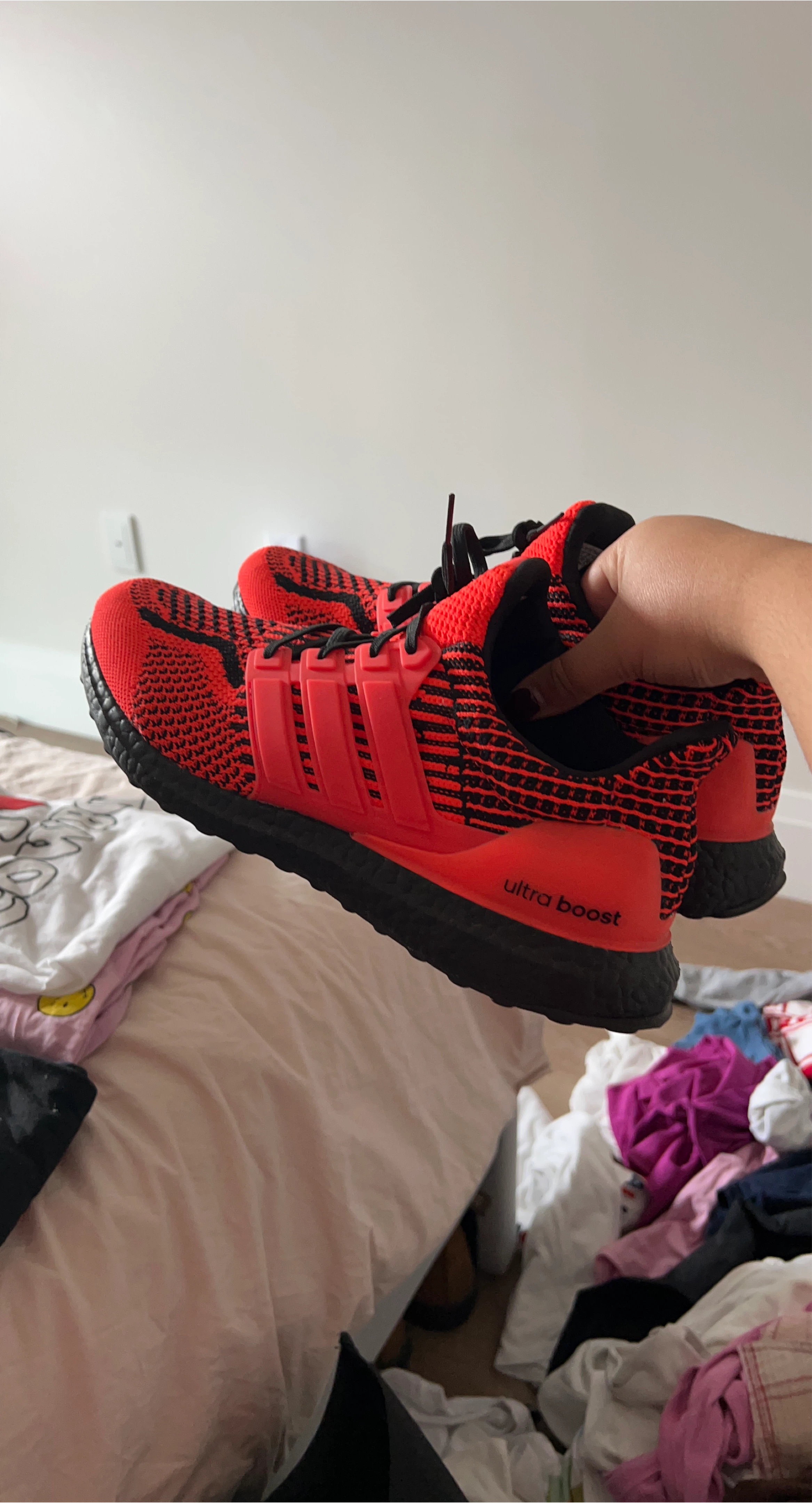 Selling a pair of Adidas Ultra Boosts in a striking red and black colourway! They're in great shape and ready for a new home. These are a size 10.5 man in US sizing. Perfect for running or just everyday wear!
