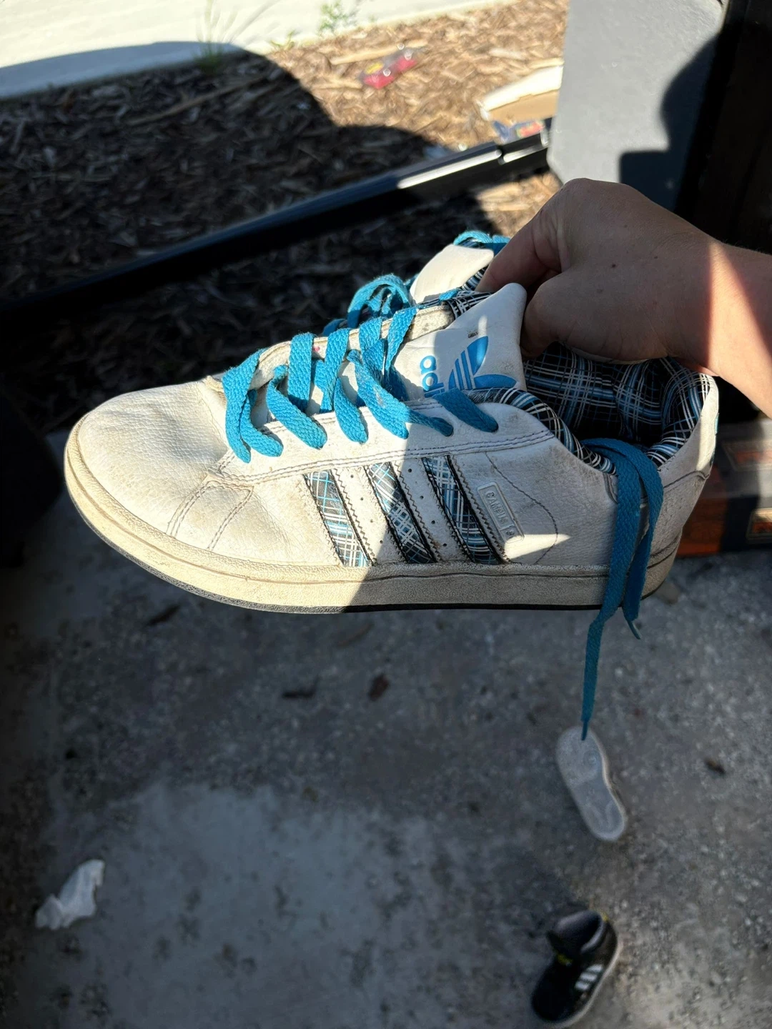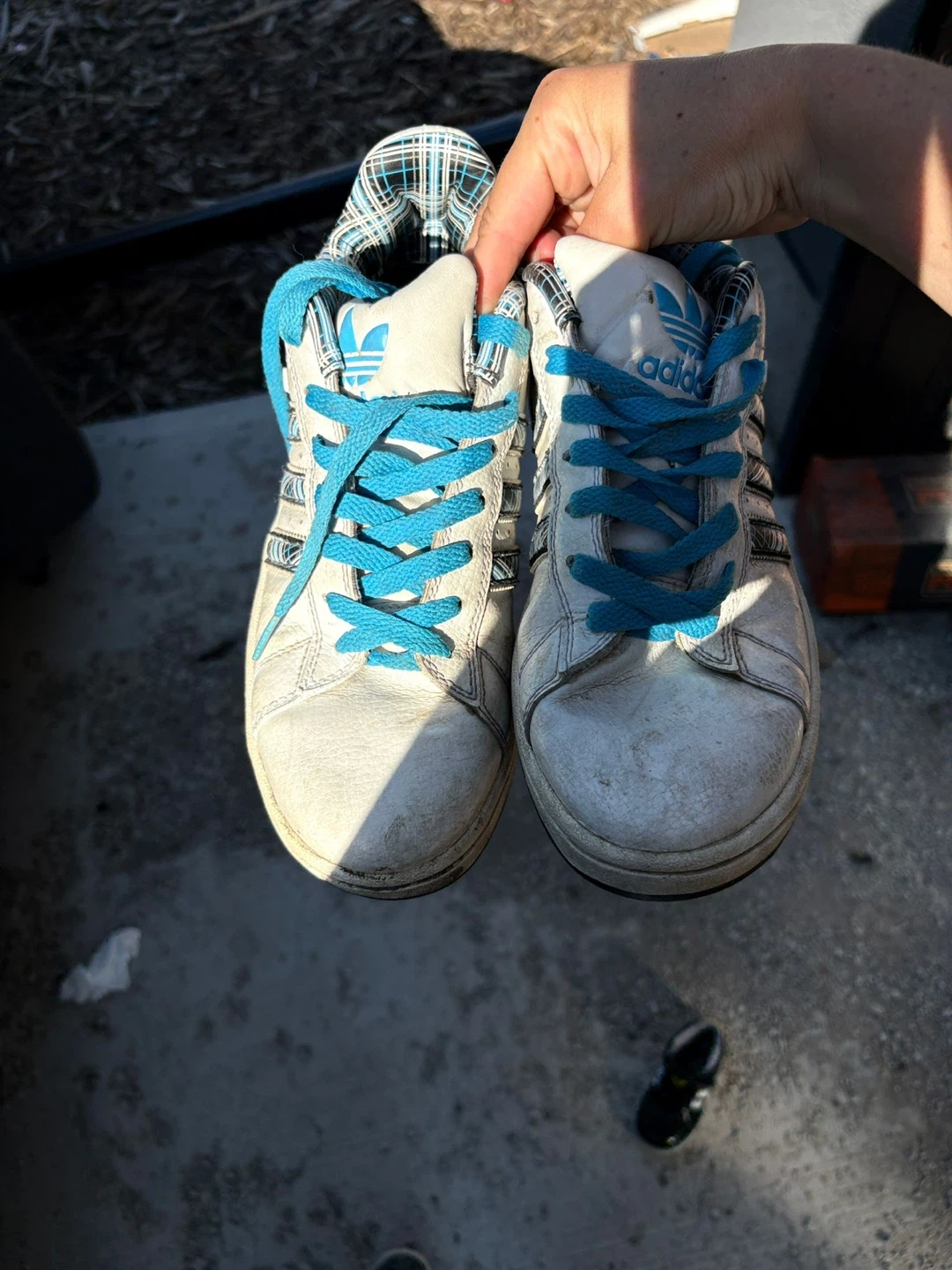 Selling a pair of Adidas sneakers. They show some signs of wear, but still have lots of life left in them! The sneakers are white with blue accents and laces.