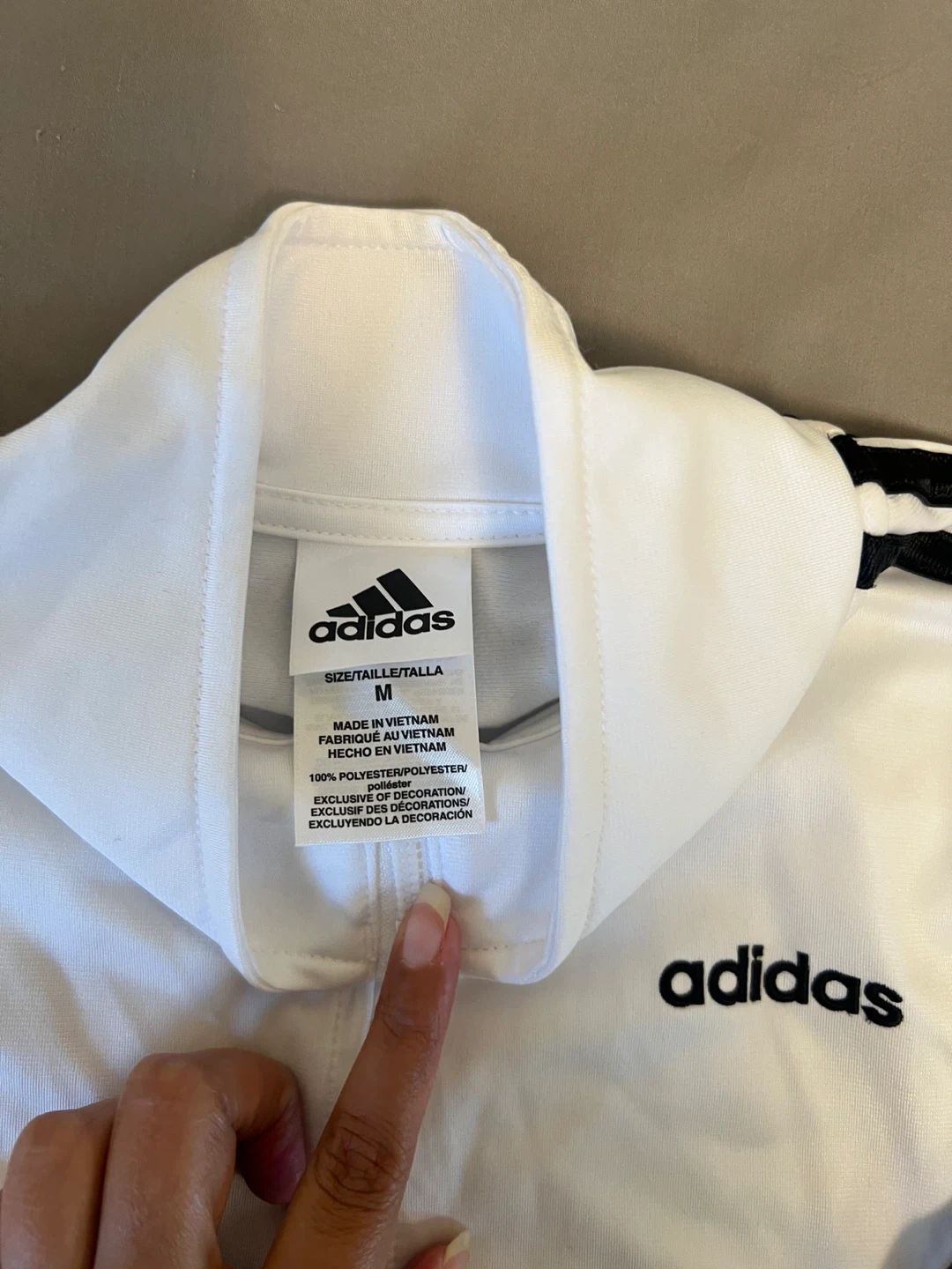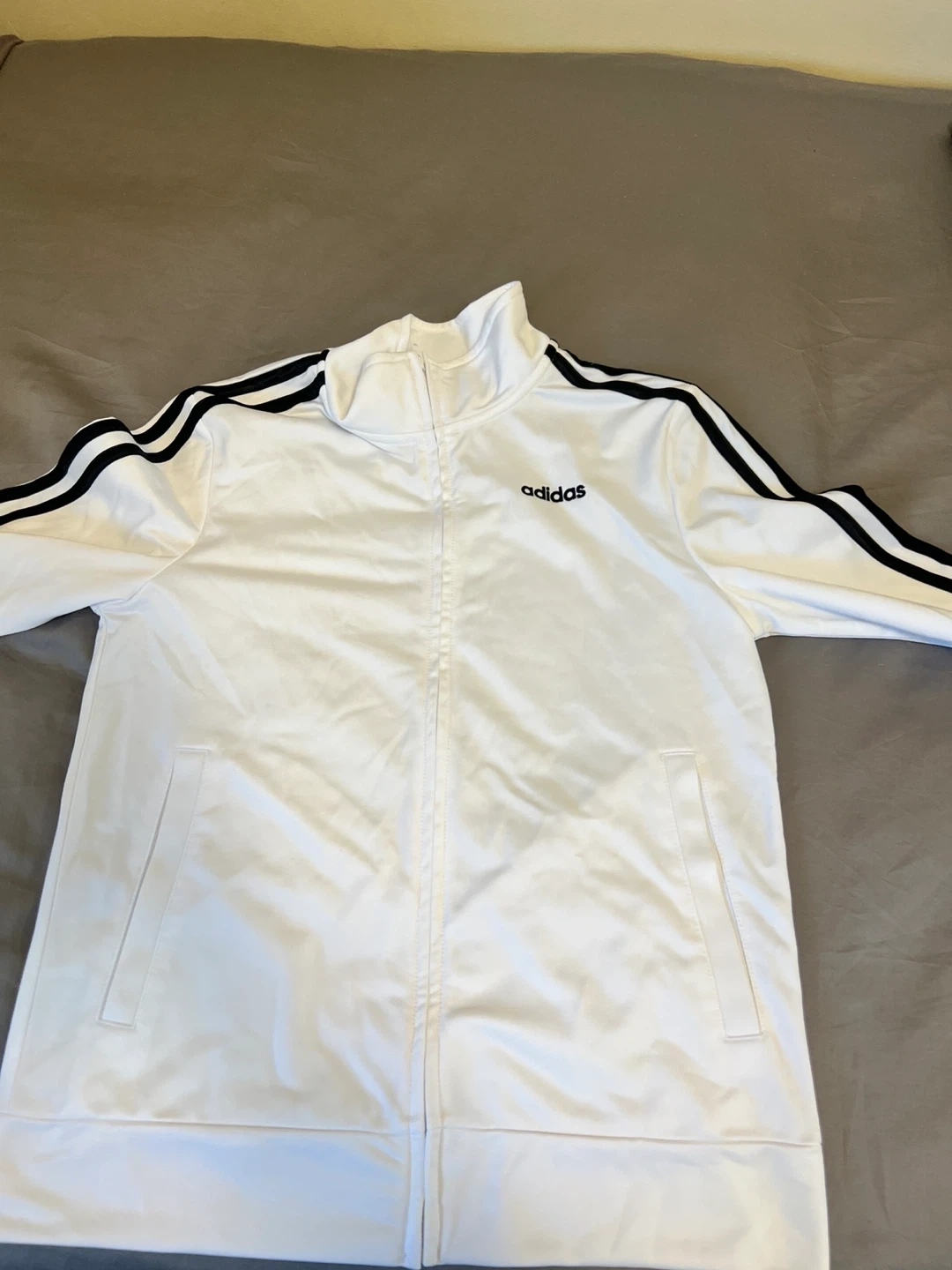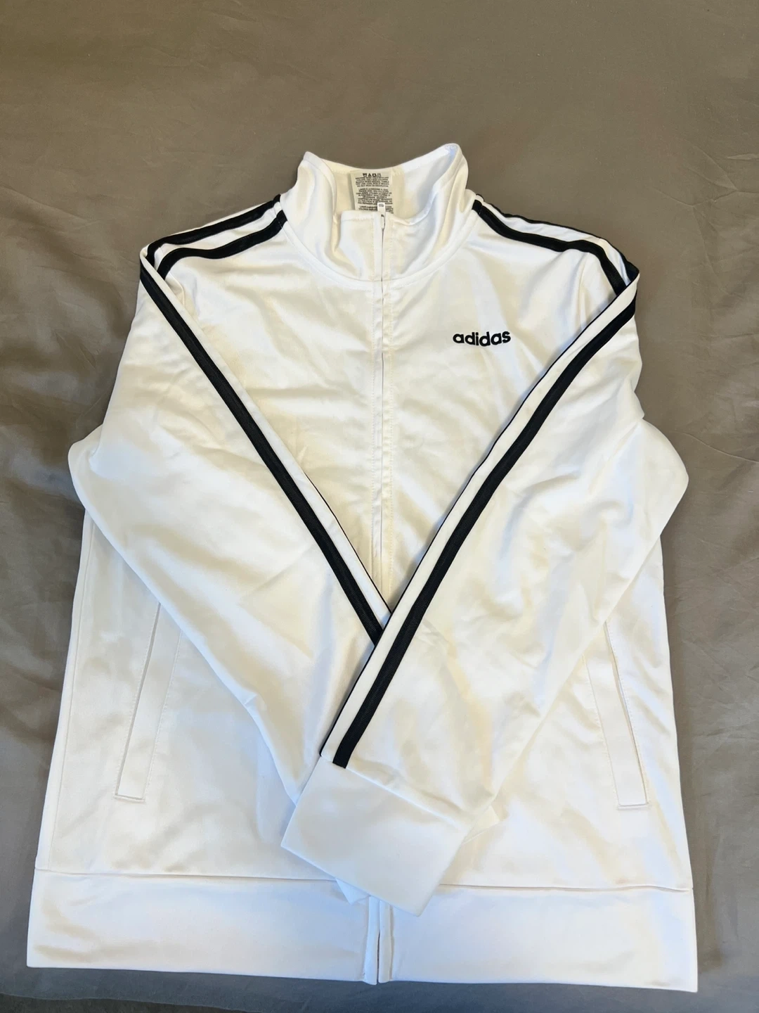 Selling a white Adidas track jacket in size medium. It features the classic three stripes on the sleeves and the Adidas logo on the chest. Made from 100% polyester, it's perfect for workouts or casual wear! Very gently used Cash only Thank you