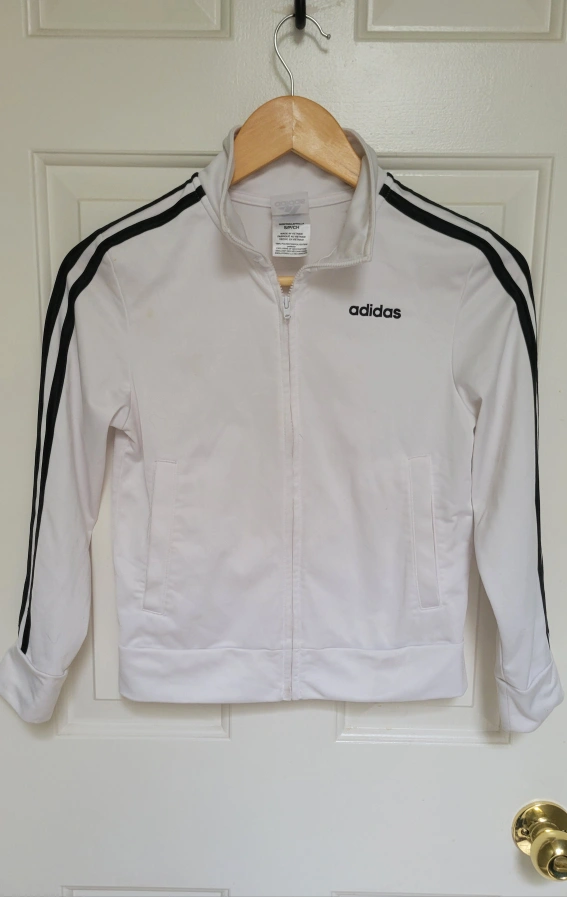Selling a white Adidas track jacket with the classic three black stripes down the sleeves. It's in great condition and a size S. Perfect for workouts or just a casual look! label says size small but it's more like extra small for youth boys or girls