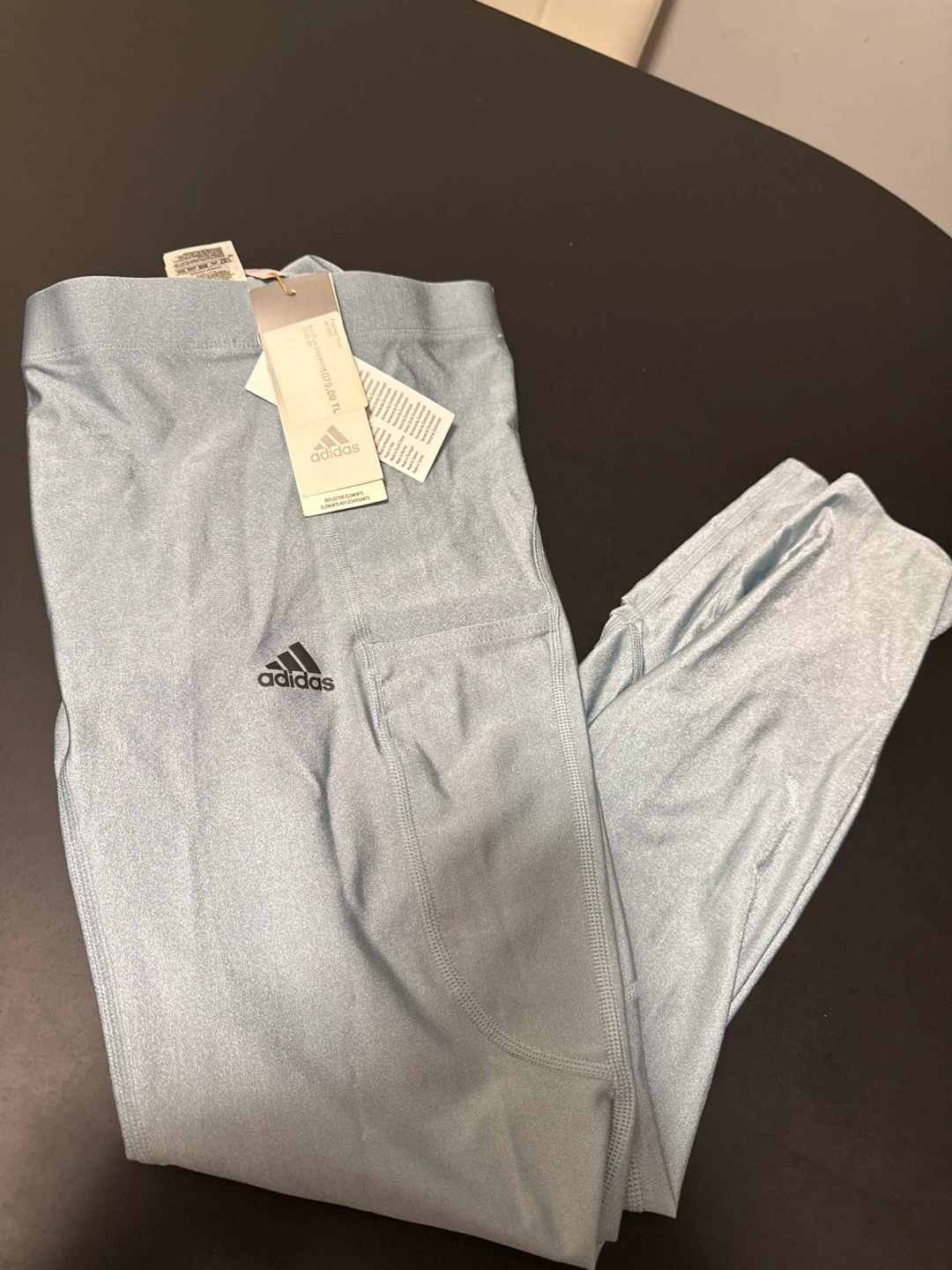 Selling a brand new pair of Adidas women's leggings, complete with tags! These leggings are a stylish light blue colour and feature a convenient side pocket. Perfect for workouts or everyday wear!