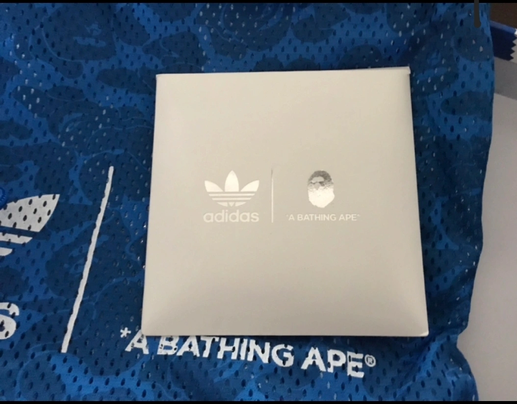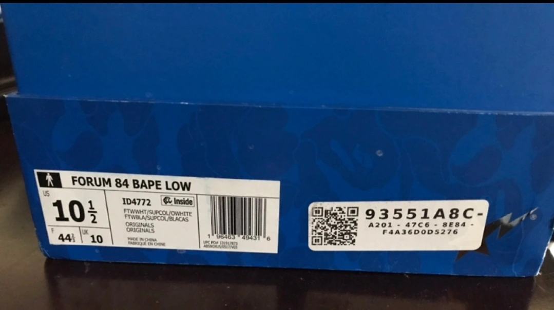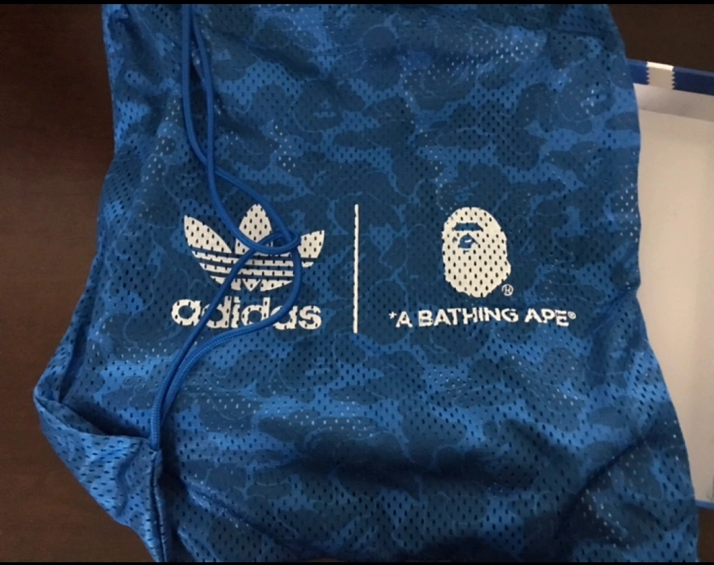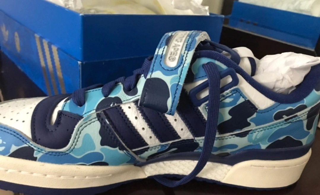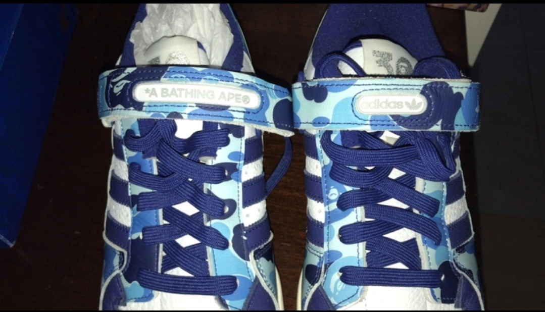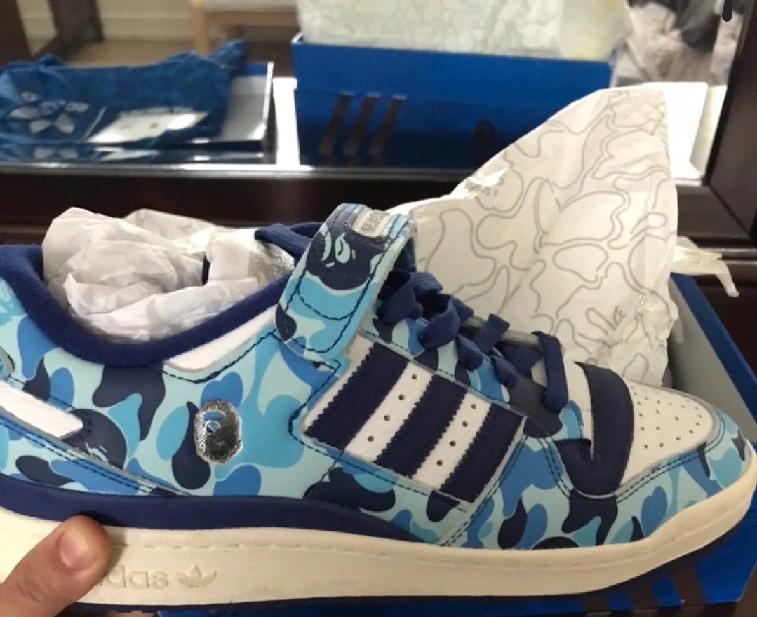 Selling a pair of Adidas x A Bathing Ape (BAPE) Forum 84 Low shoes. These stylish sneakers feature a unique blue camo design that really stands out. They come with the original box and a matching drawstring bag, perfect for keeping them in top condition. A great addition to any sneaker collection!