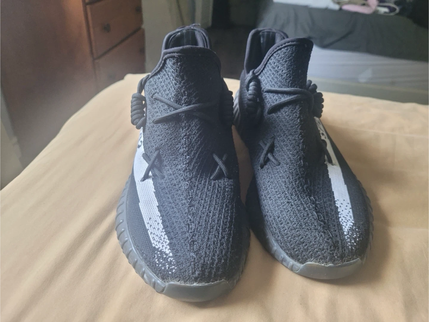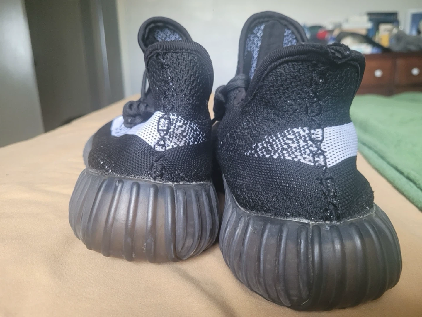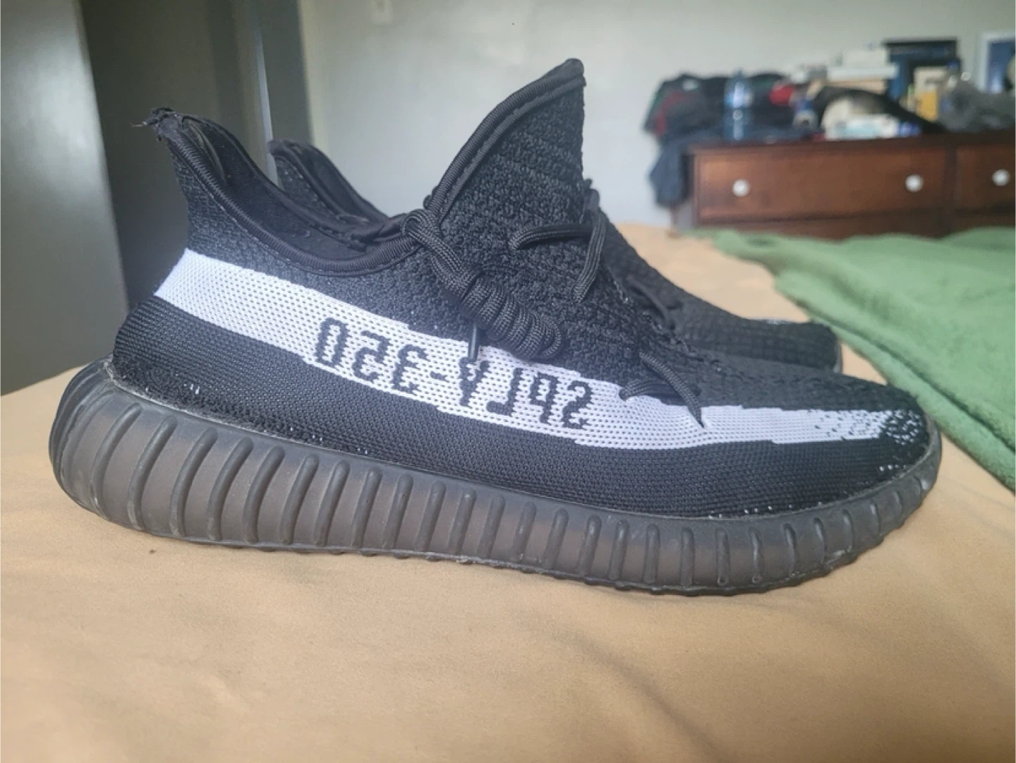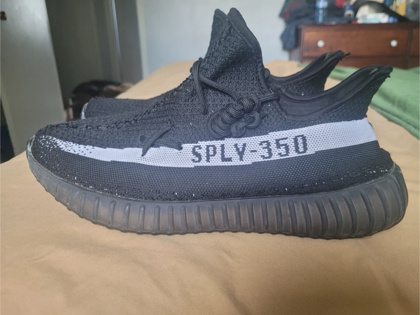 Selling a pair of Adidas Yeezy Boost 350 in the Oreo colourway. These are in used condition, but still have lots of life left! The 'SPLY-350' text is visible on the side, a signature detail of this model