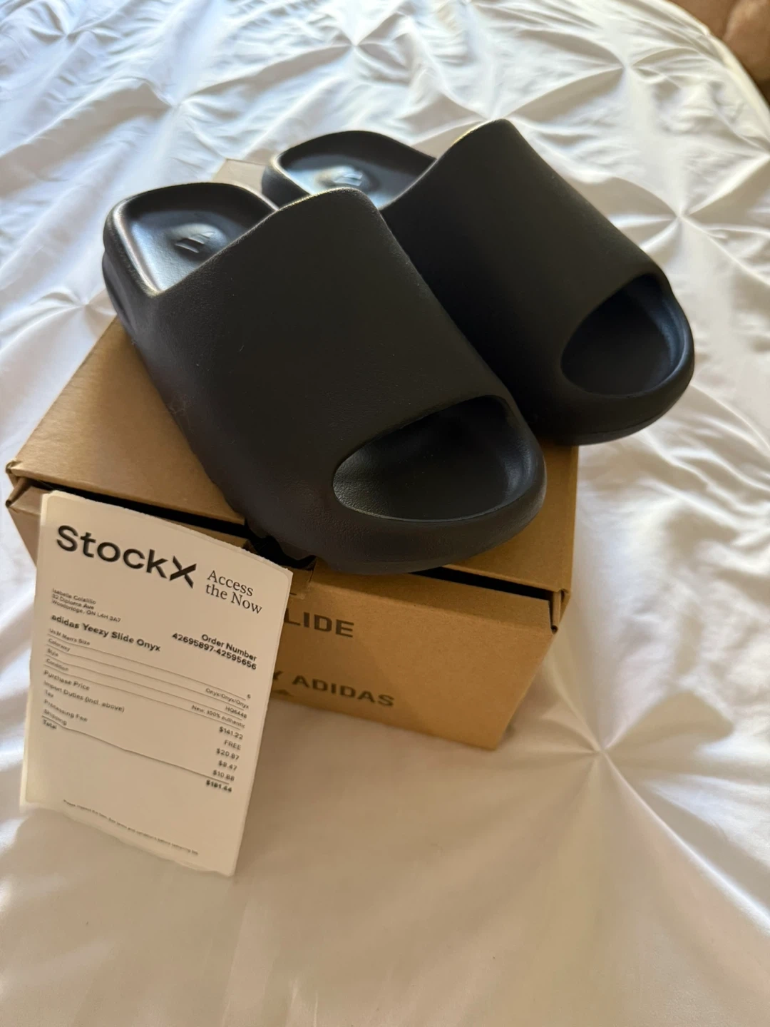 Selling a pair of Adidas Yeezy Slides in the Onyx colour! These are super comfy and stylish for everyday wear. Comes with the original box and a StockX verification tag. A great addition to your footwear collection!