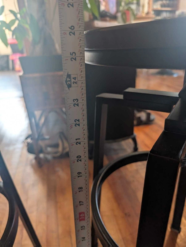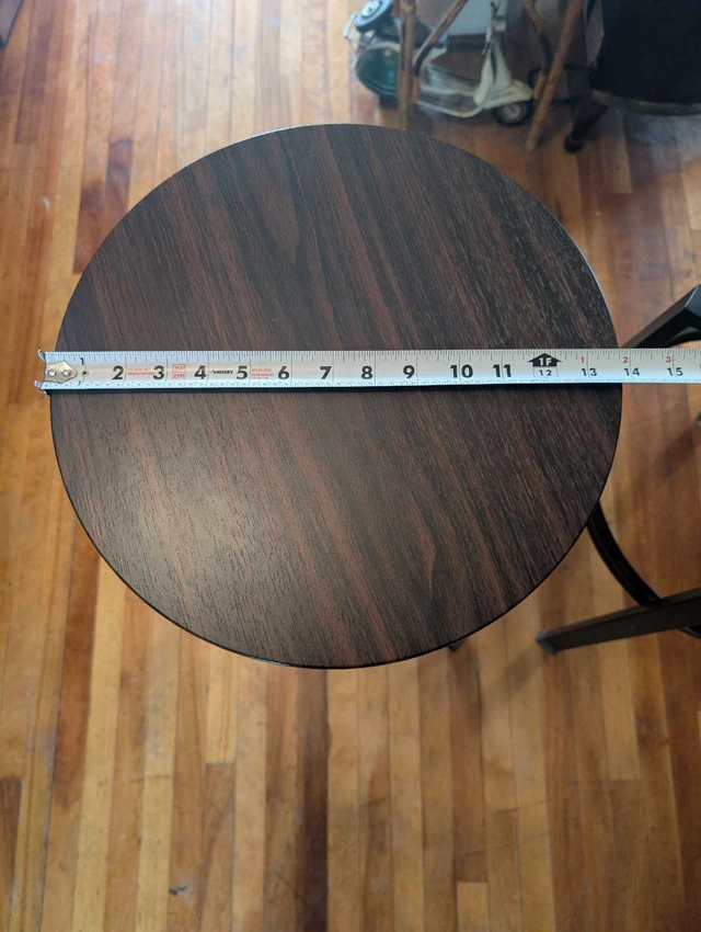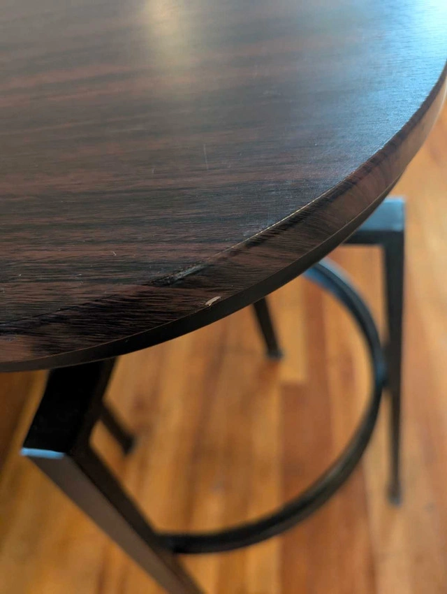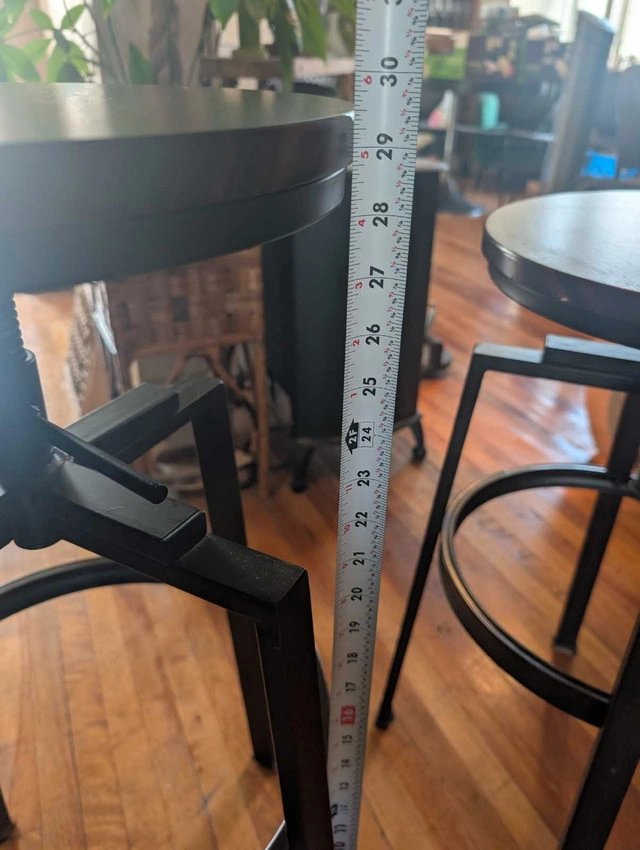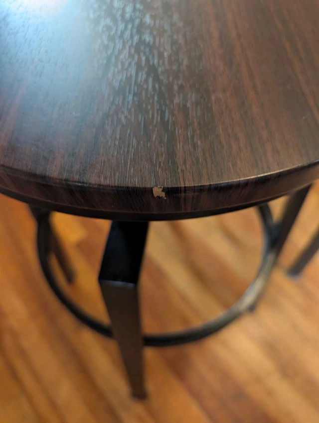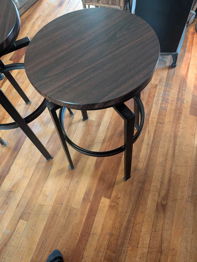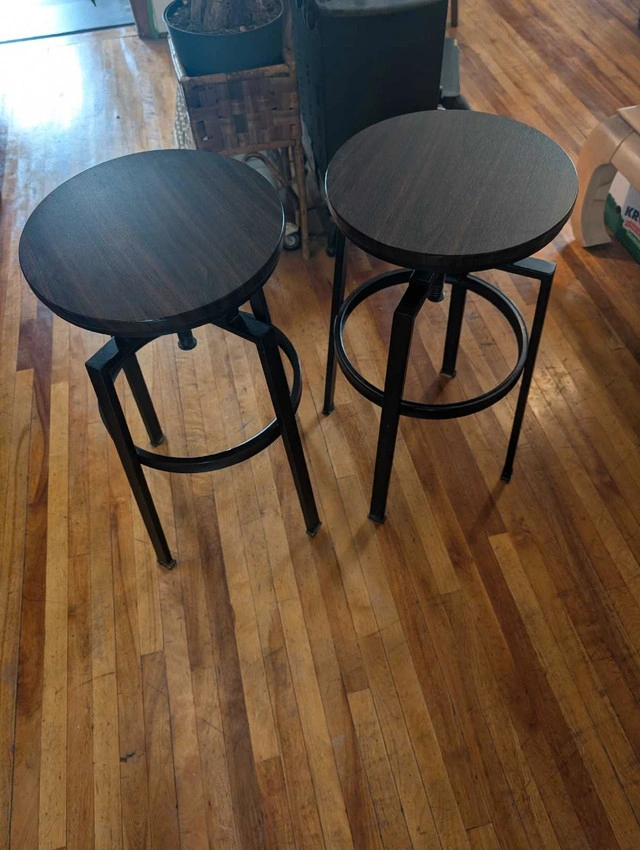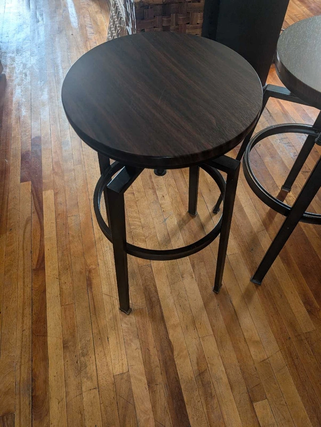 Selling a set of two bar stools. They feature a dark wood laminate seat and black metal frame. Great for a kitchen island or bar area! Circumference = 14" Height = 26" to 29 1/2". 1 Stool has a couple of light scratches on top. 1 Stool has a couple of small Knicks on edge. Otherwise they are in excellent condition. For Sale By: Owner