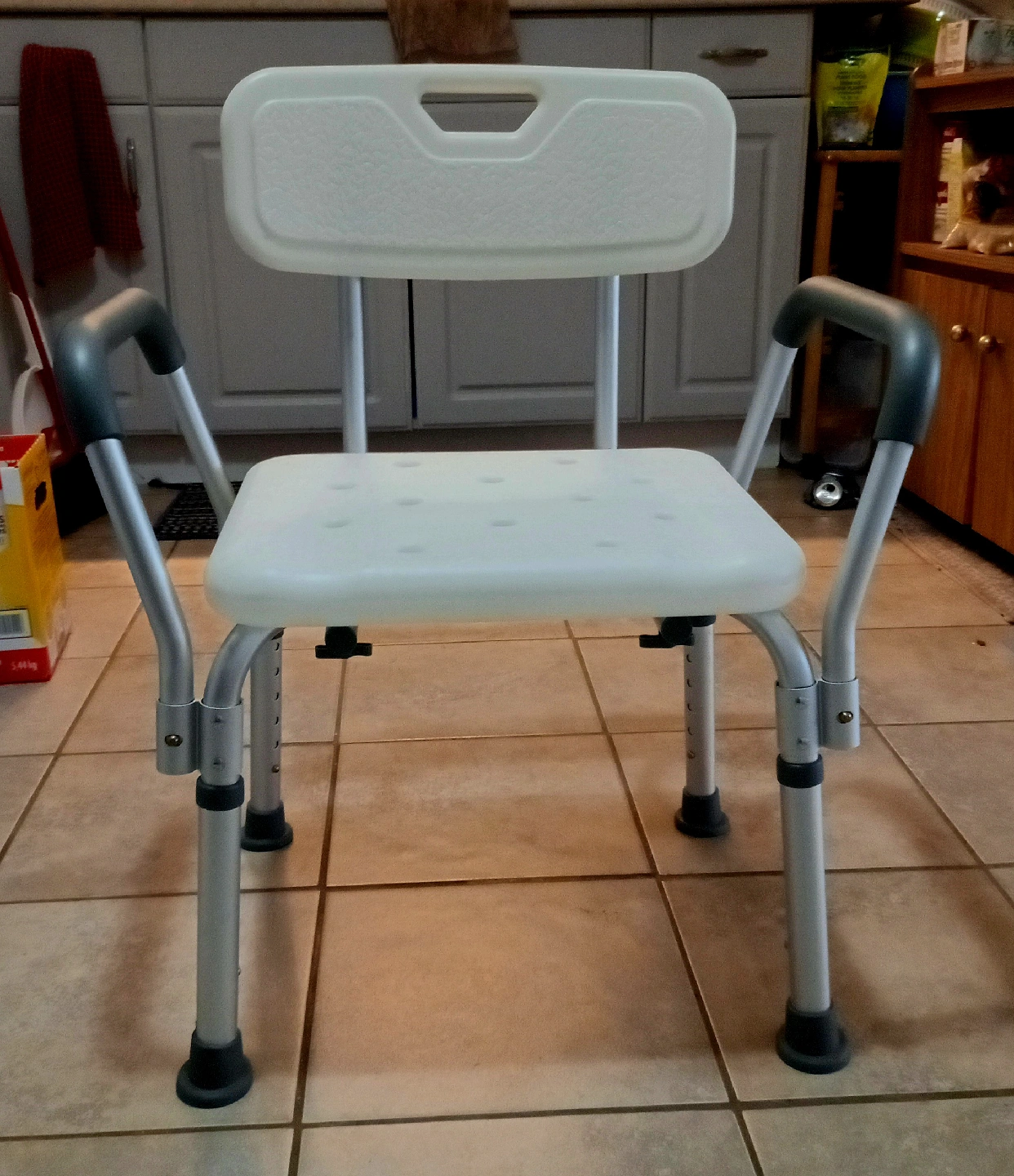 Selling an assembled, but only used once bath/shower chair. It features adjustable legs for finding the perfect height and a back for added support. It's perfect for anyone needing a little extra help in the shower or bath!