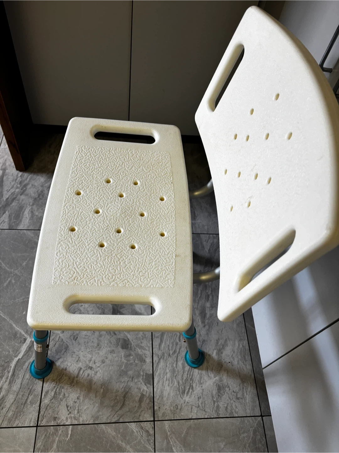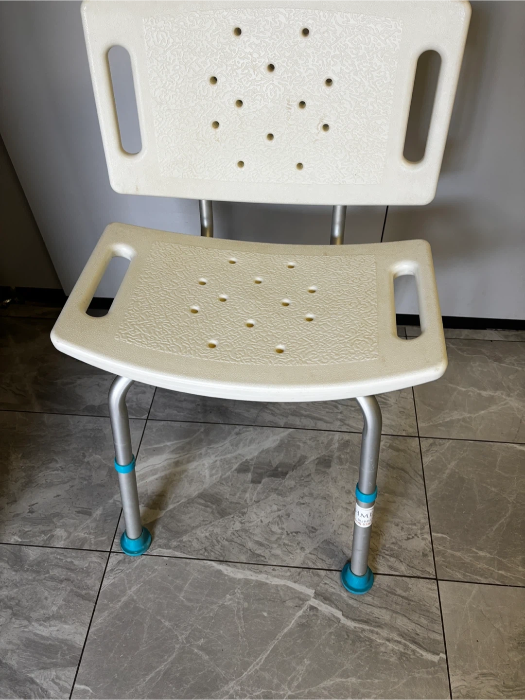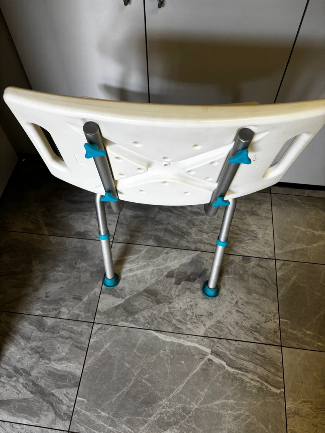 Selling a bath/shower chair with a backrest. It features adjustable legs with blue accents. It's in great condition and ready to use in your bathroom