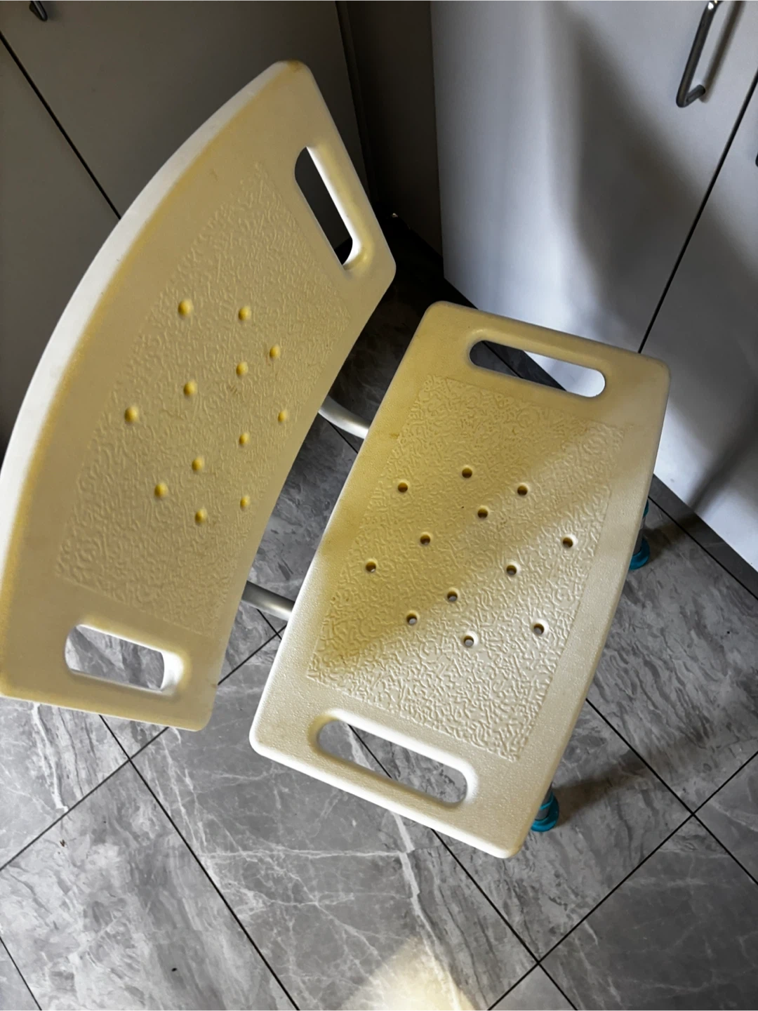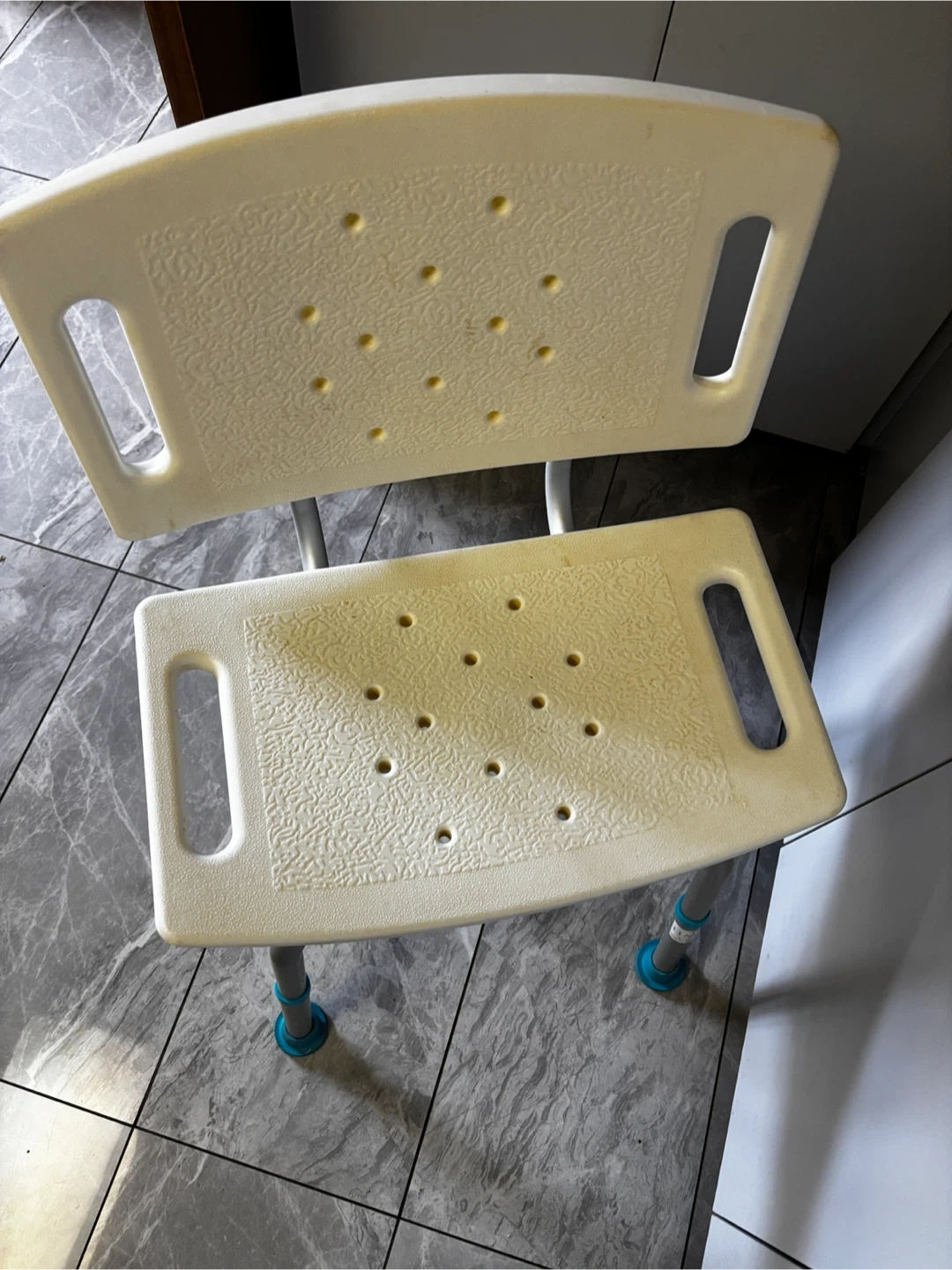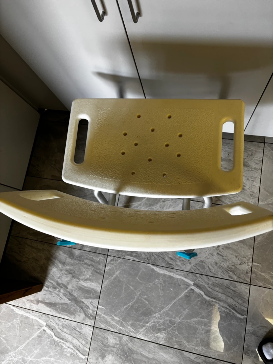 Selling a bath/shower chair with a backrest. It features adjustable legs with blue accents. It's in great condition and ready to use in your bathroom
