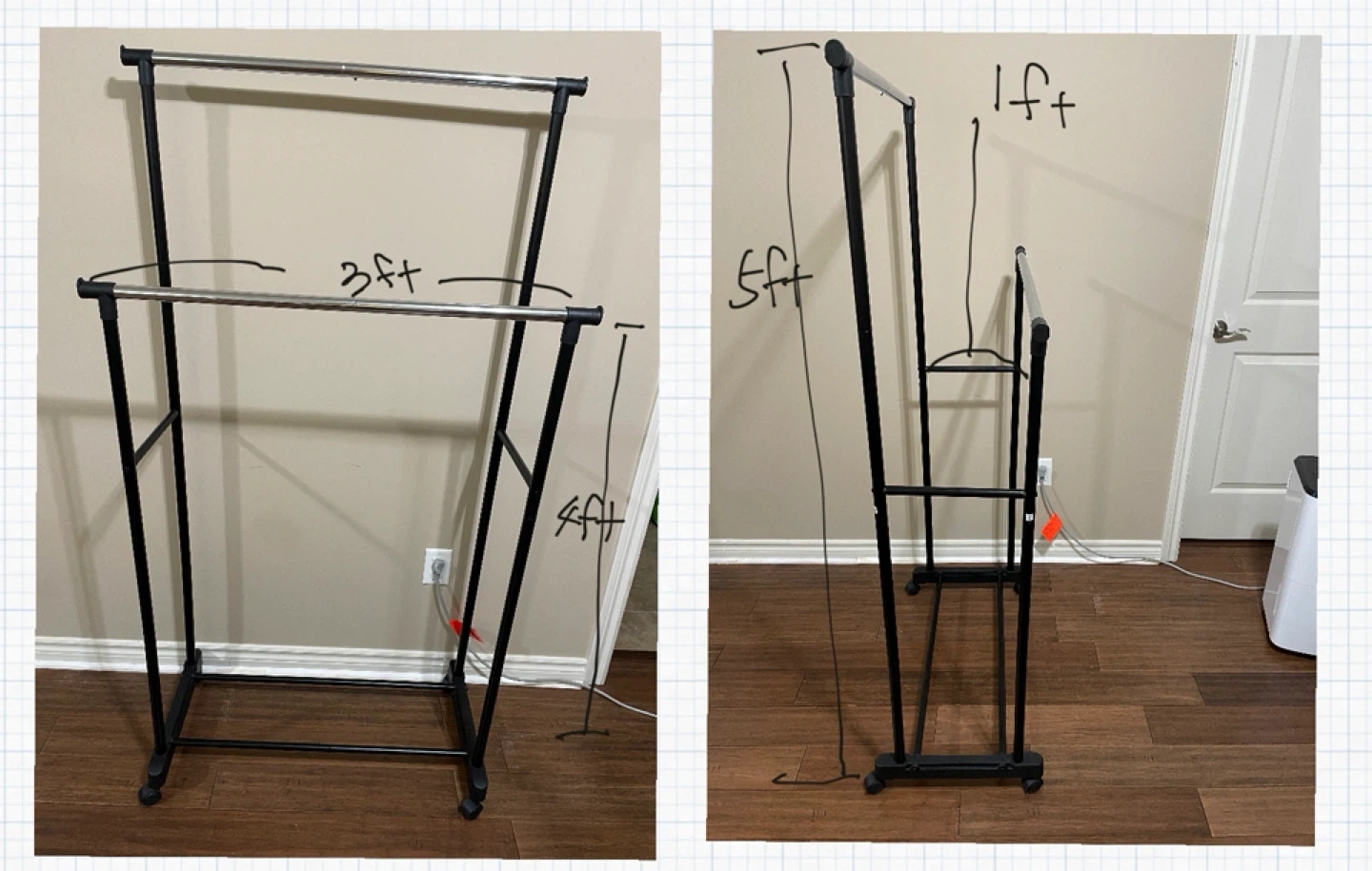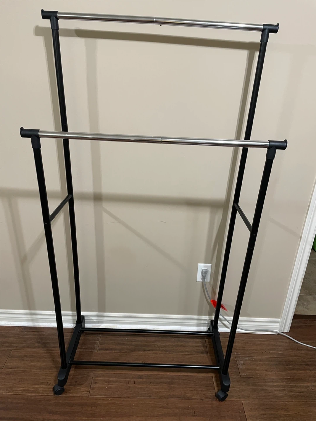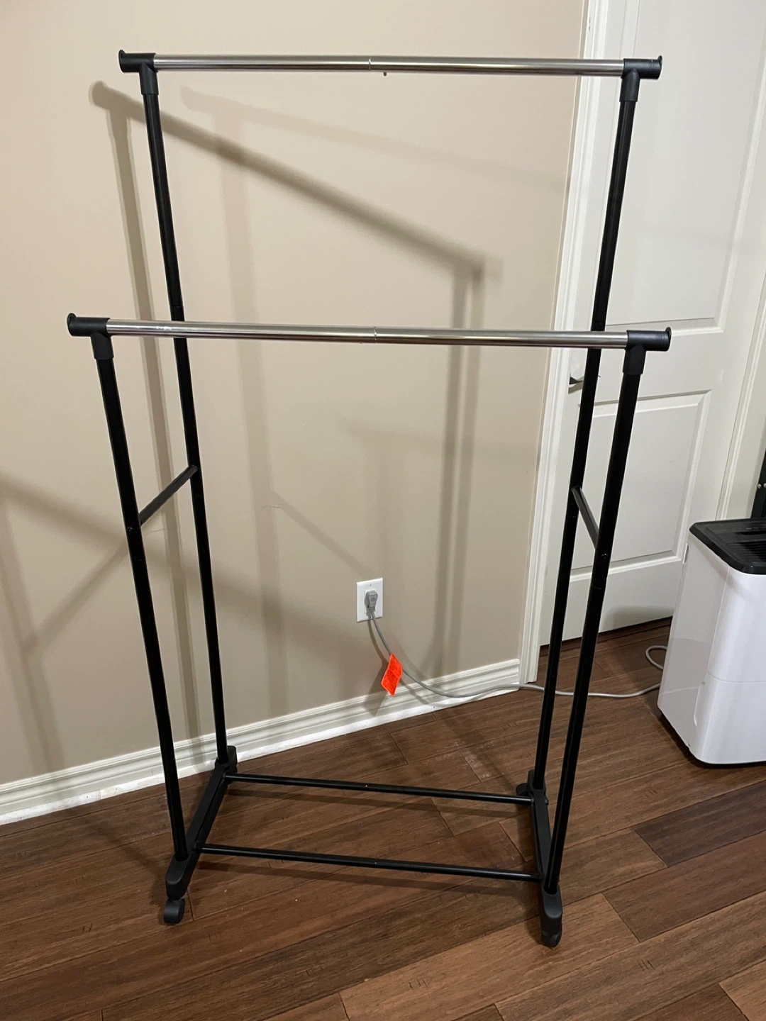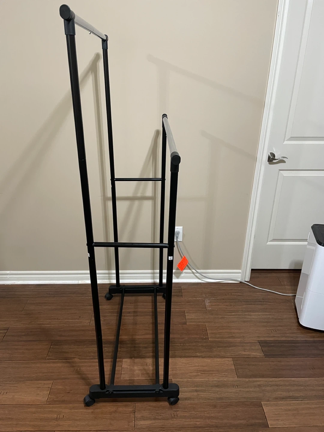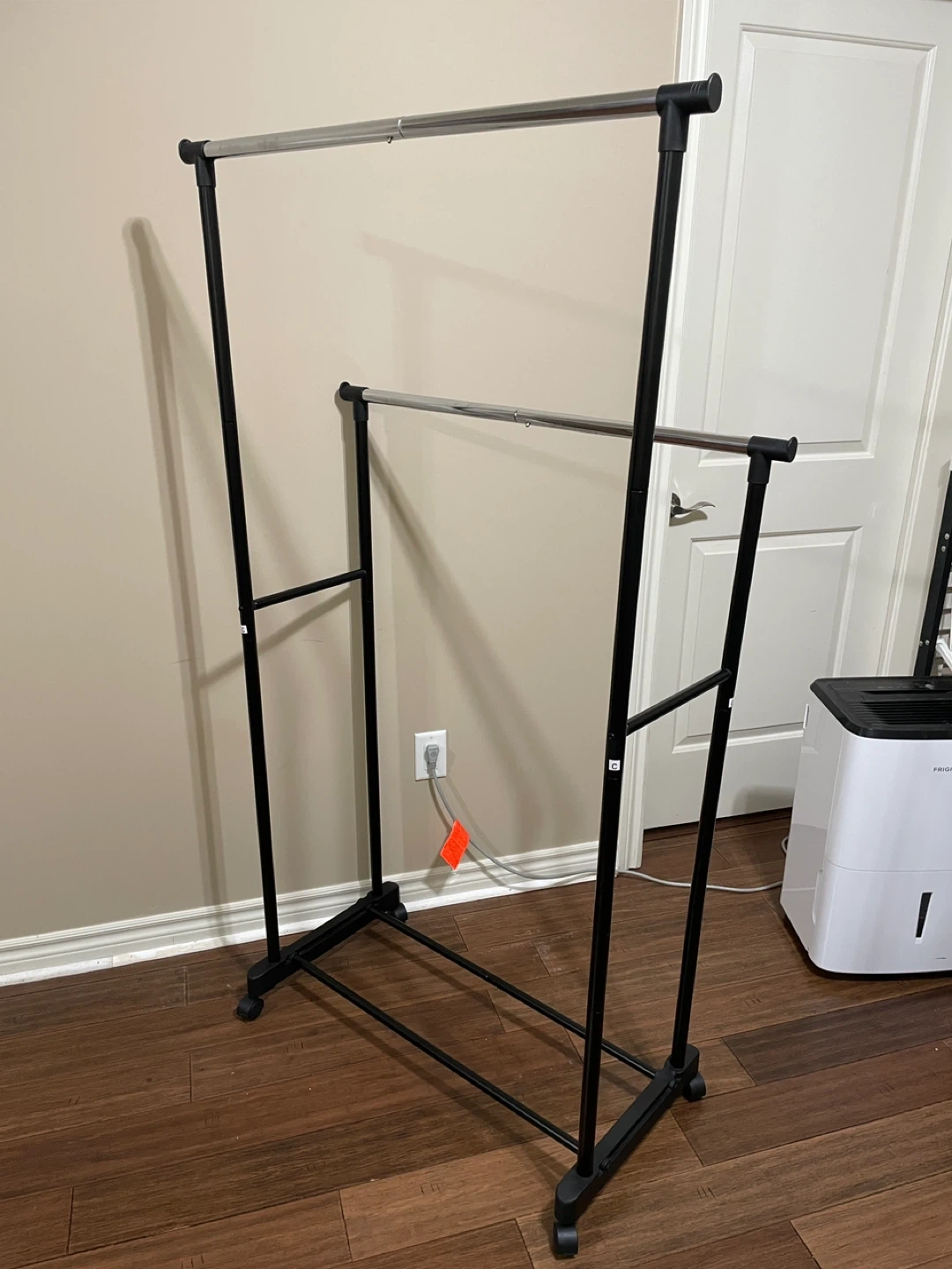 Selling a handy adjustable double rod clothing rack! It's great for maximizing closet space or creating extra storage in a small room. The rack is black and features two rods for hanging clothes. It's approximately 5 feet tall and 3 feet wide, with a depth of about 1 foot. Perfect for organizing your wardrobe!