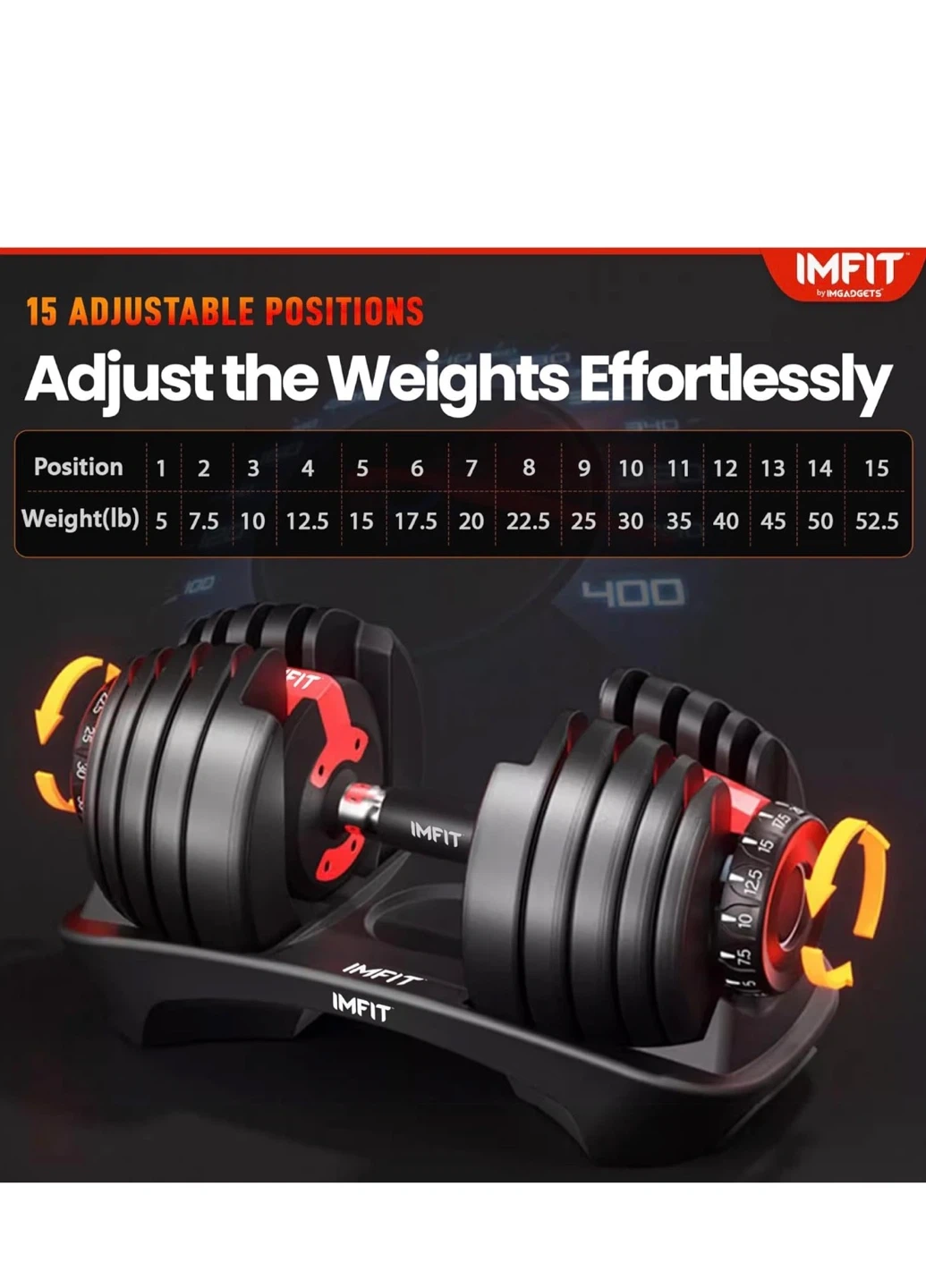 Selling an IMFIT adjustable dumbbell! You can easily adjust the weights from 5 to 52.5 lbs with 15 adjustable positions. It's a great way to save space and get a full workout at home