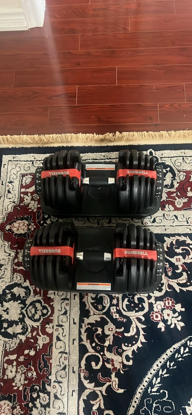 Selling a pair of adjustable dumbbells. They are in great shape and ready for a new home gym! Perfect for saving space and getting a full workout 5 pounds - 52.5 Pounds