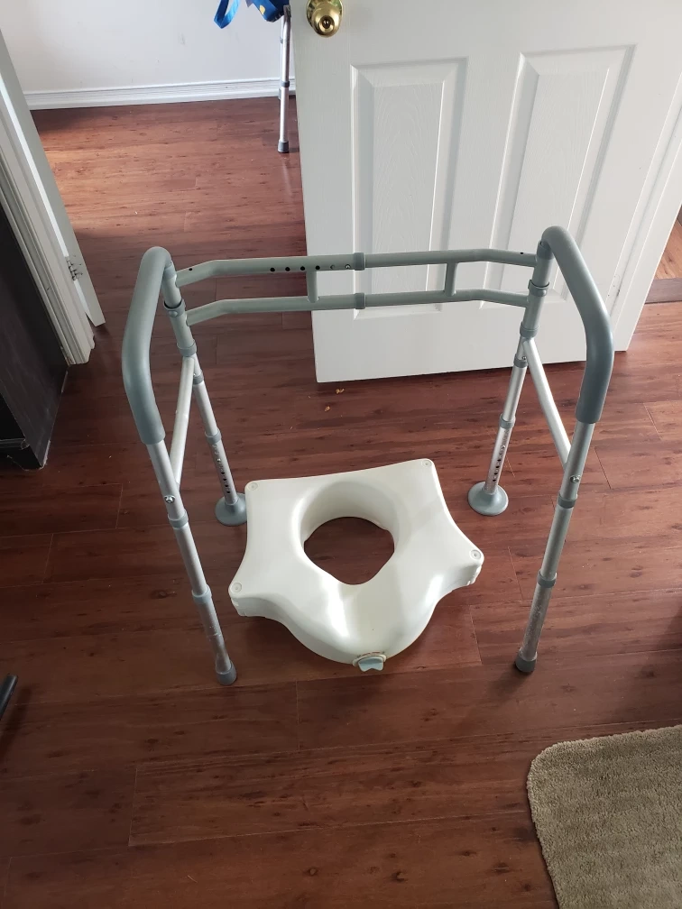 Selling a toilet safety frame with a raised seat. The height is adjustable. It's in good condition and ready to use