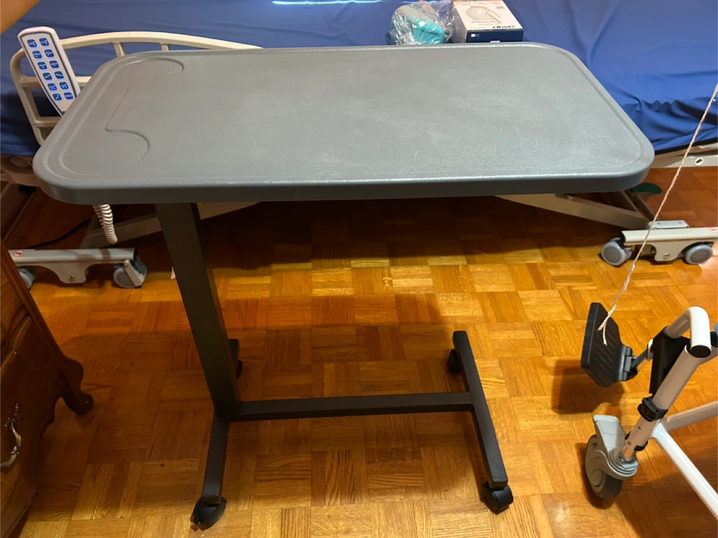 Selling an adjustable overbed table with wheels. It's perfect for use while in bed or sitting in a chair. It's in great condition and ready for a new home!