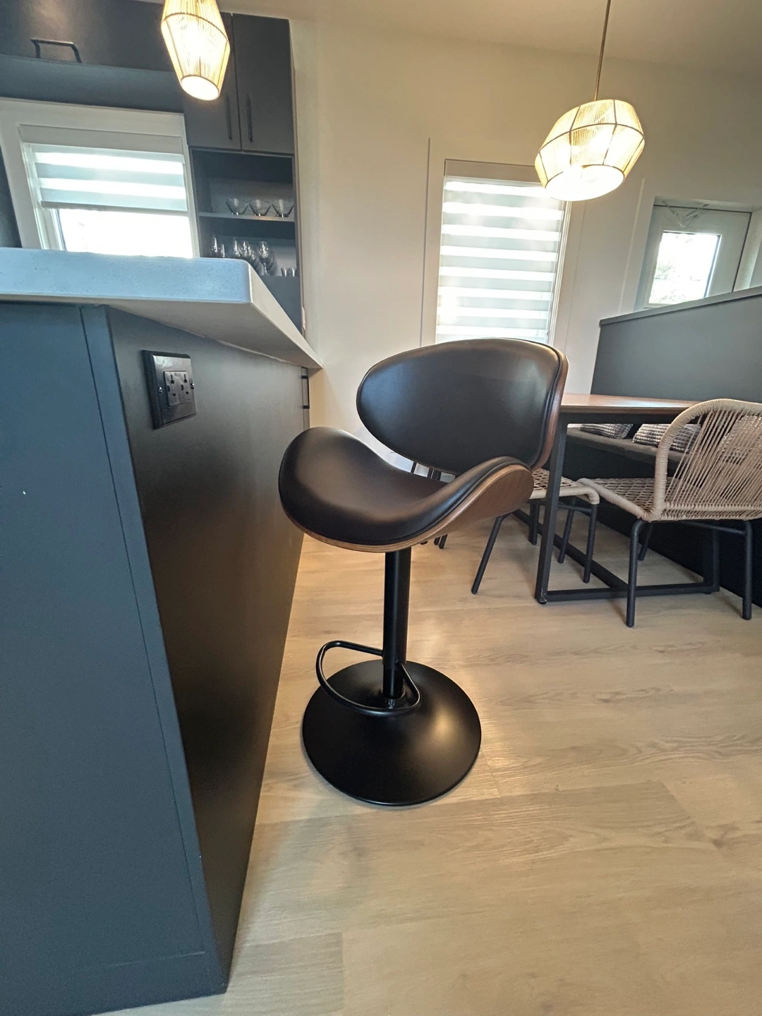 Set of 3 Modern Luxury Bar Stools β Like New! $200 each Elevate your kitchen or home bar with this stunning set of adjustable bar stools. Featuring curved walnut backs, cushioned faux leather seats, and matte black bases with footrests for comfort and style. π€ Sleek, modern design π§ Gas-lift adjustable height πͺ Swivel seats for easy movement π― Excellent condition β barely used Snag all 3 for a fraction of retail!
