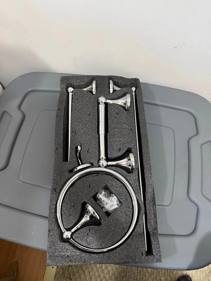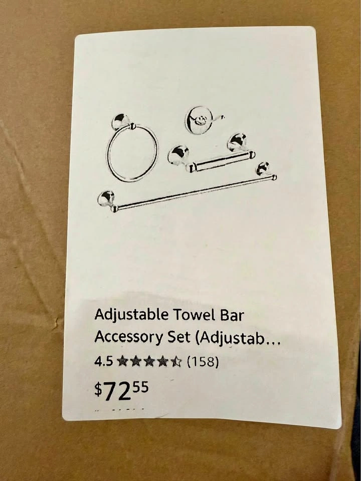 Upgrade your bathroom with this stylish Adjustable Towel Bar Accessory Set. Durable chrome finish matches any décor and adds a polished touch. Includes adjustable towel bar, towel ring, toilet paper holder, and robe hook. Sleek chrome finish – modern and easy to clean. Durable construction for long-lasting use. Simple installation with included hardware. Retail price: $72.55 – save big! Brand new in packaging – never installed. Asking $40 (or best offer).