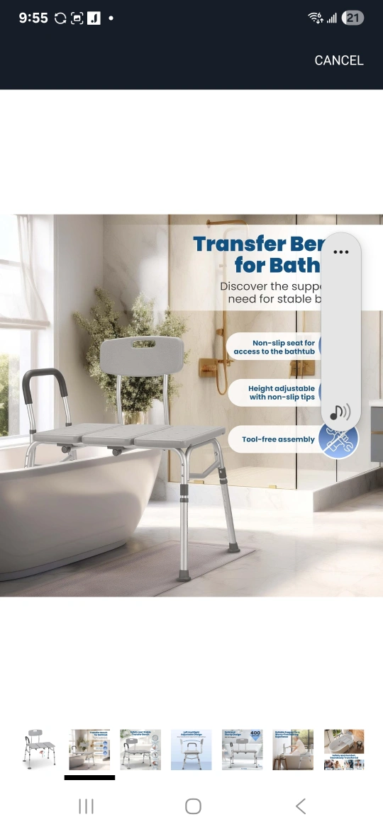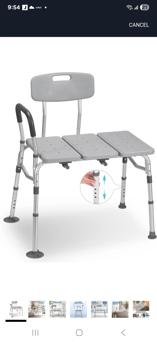 I'm selling an adjustable transfer bench for the bath. It's designed to provide support for stable bathing. It features a non-slip seat for access to the bathtub, height-adjustable legs with non-slip tips, and tool-free assembly. Great for anyone needing a little extra help in the bathroom! never used