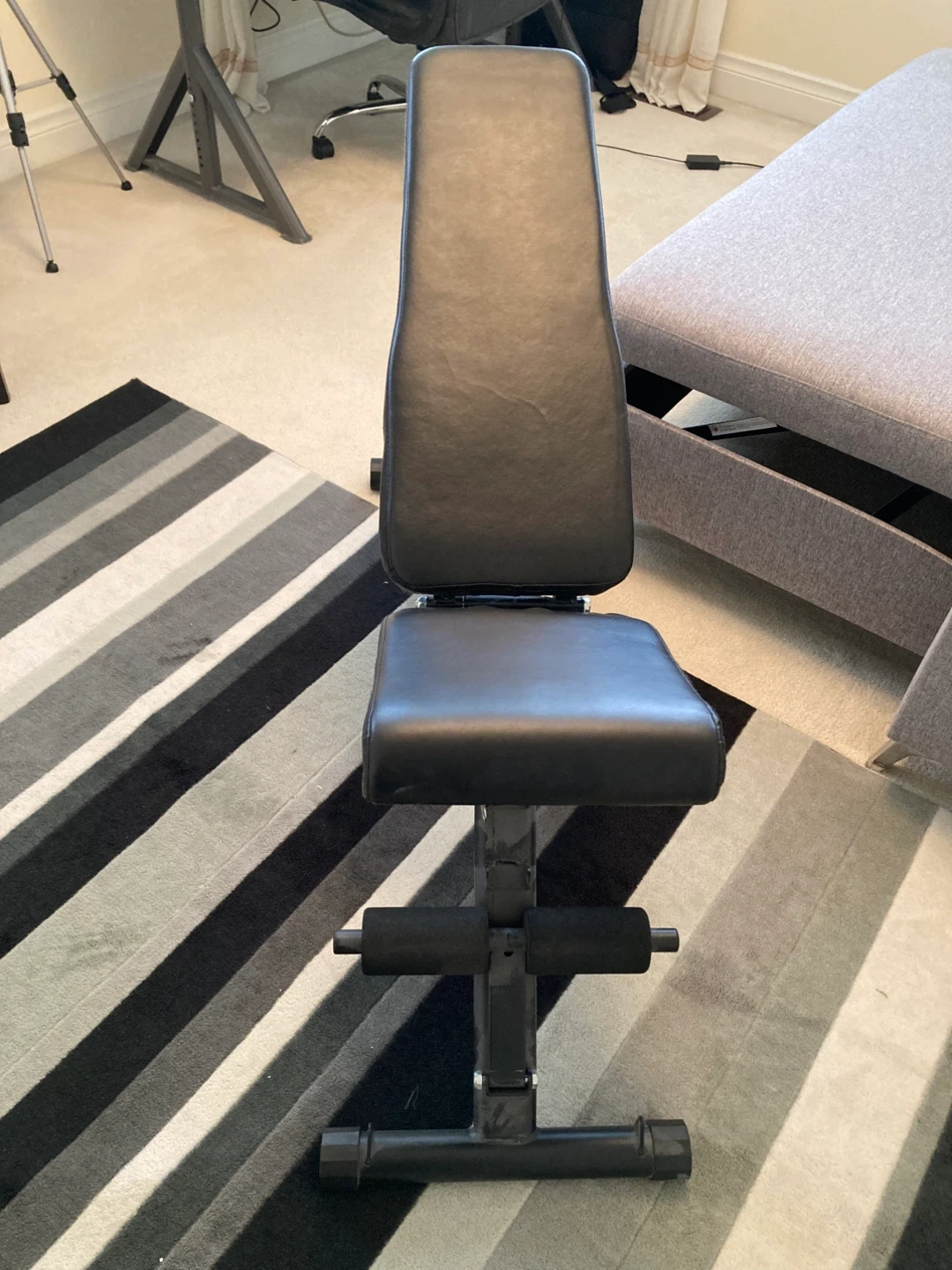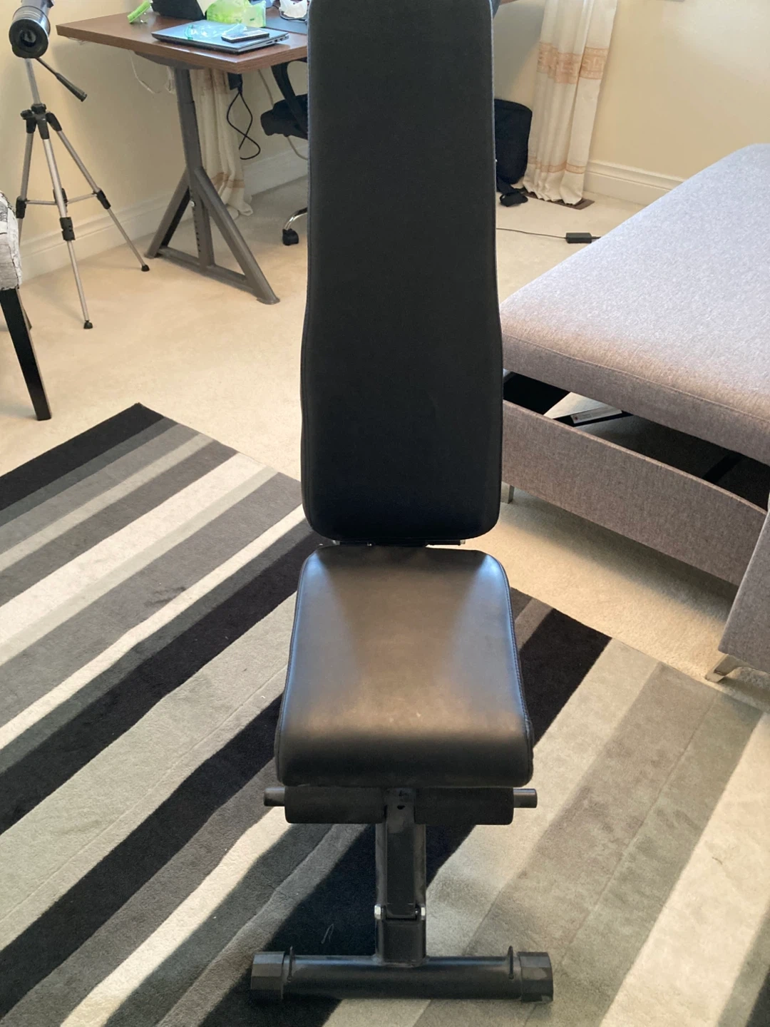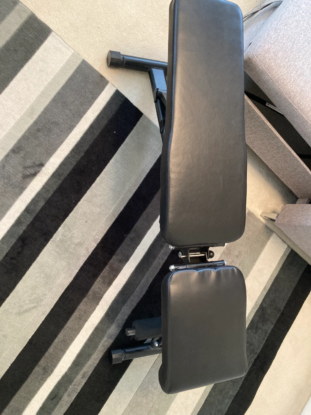 Selling an adjustable weight bench in black. It's in great shape and ready for your home gym. This bench is perfect for various exercises and is easily adjustable for different positions Price is negotiable ๐