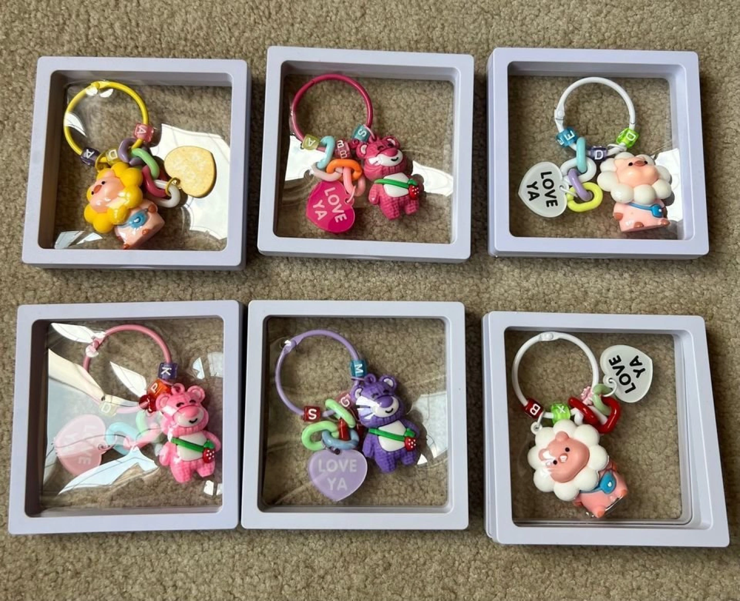 Cute animal keychains. Each features a colourful animal charm, letter beads, and a heart-shaped charm that says "Love Ya". Perfect for bags or backpacks.