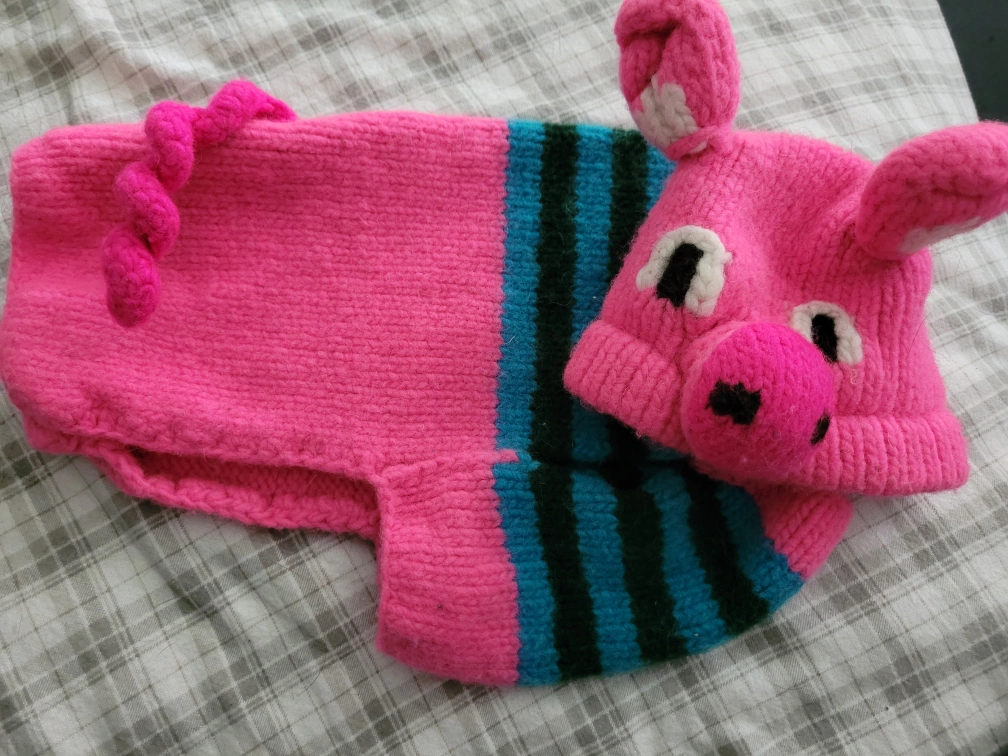 Hand-knitted dog sweater. Pink with teal , little piggies tail and hood. Adorable design. Perfect for small dogs. Fits approximately 8 to 10 lb dog. Reason for sale is downsizing to move with as little as possible.