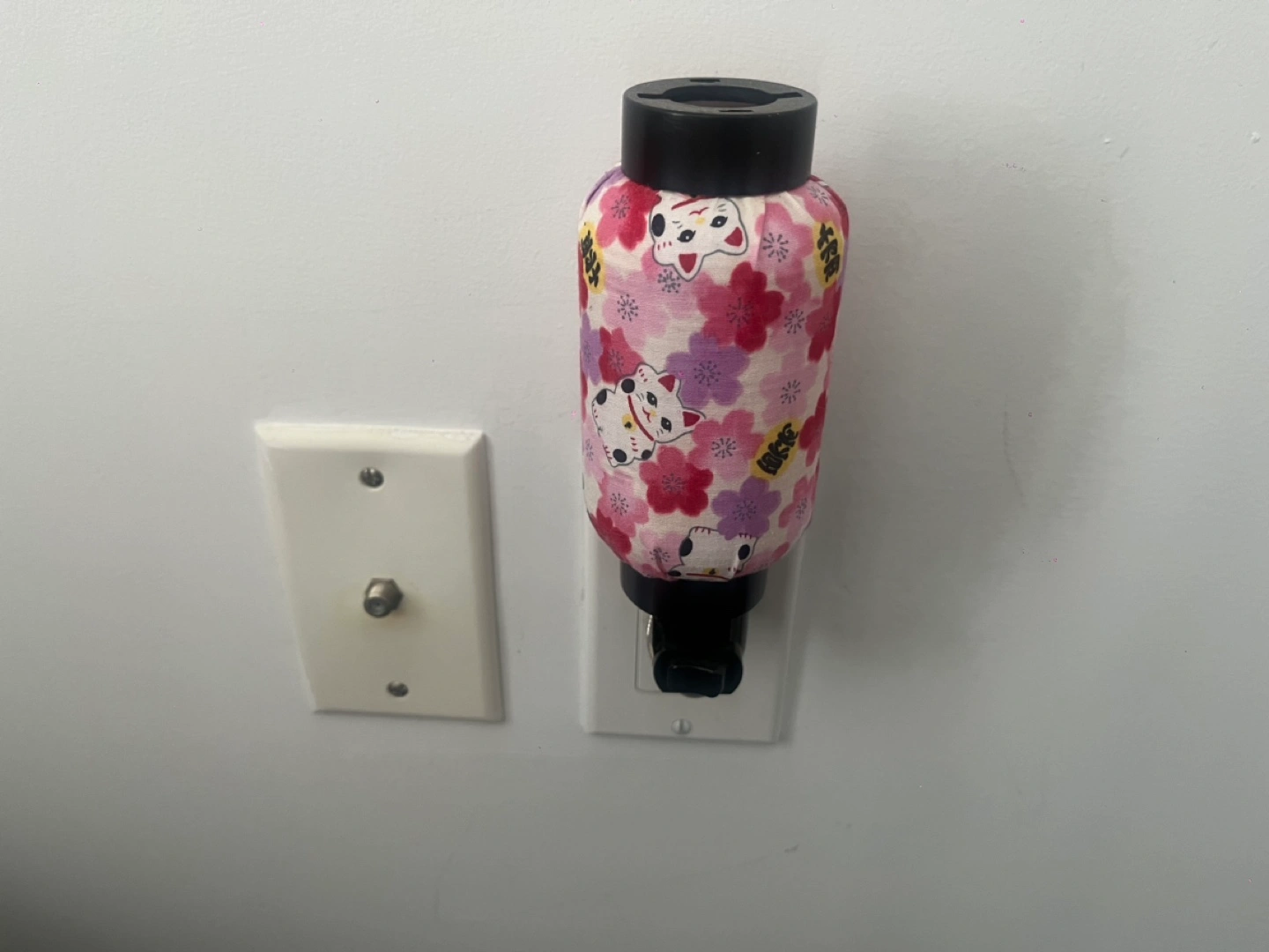 Plug-in night light. Features a Maneki-Neko (lucky cat) design. Soft warm light. Perfect for bedrooms or children's rooms.