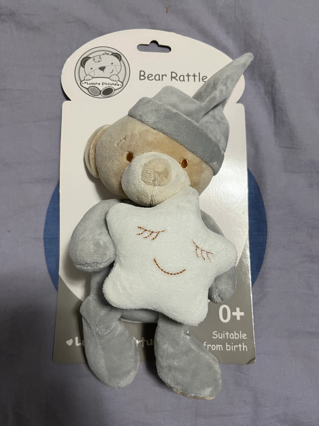 Grey plush bear rattle. Soft and cuddly. Holding a star. Suitable from birth. Perfect baby shower gift.