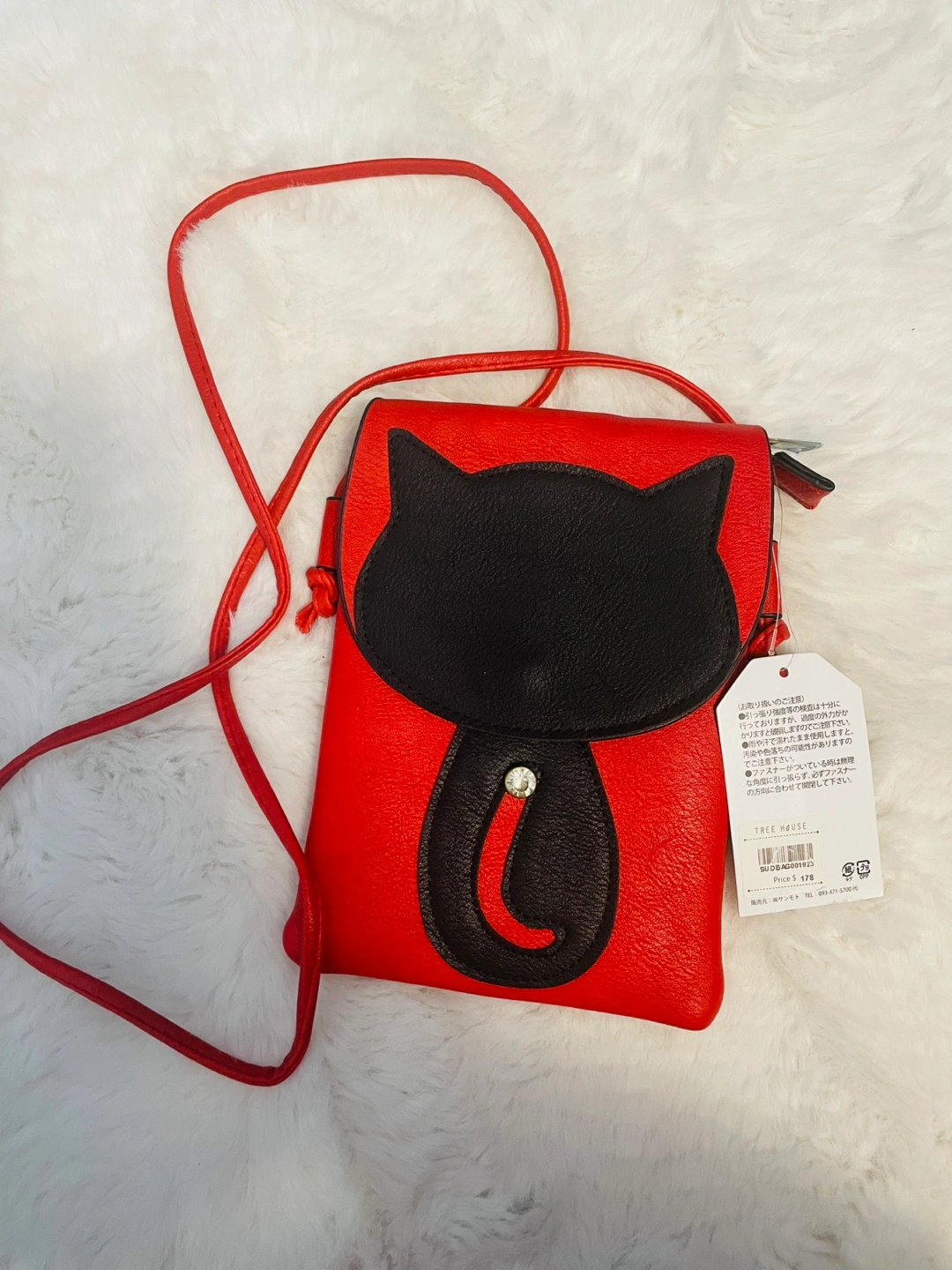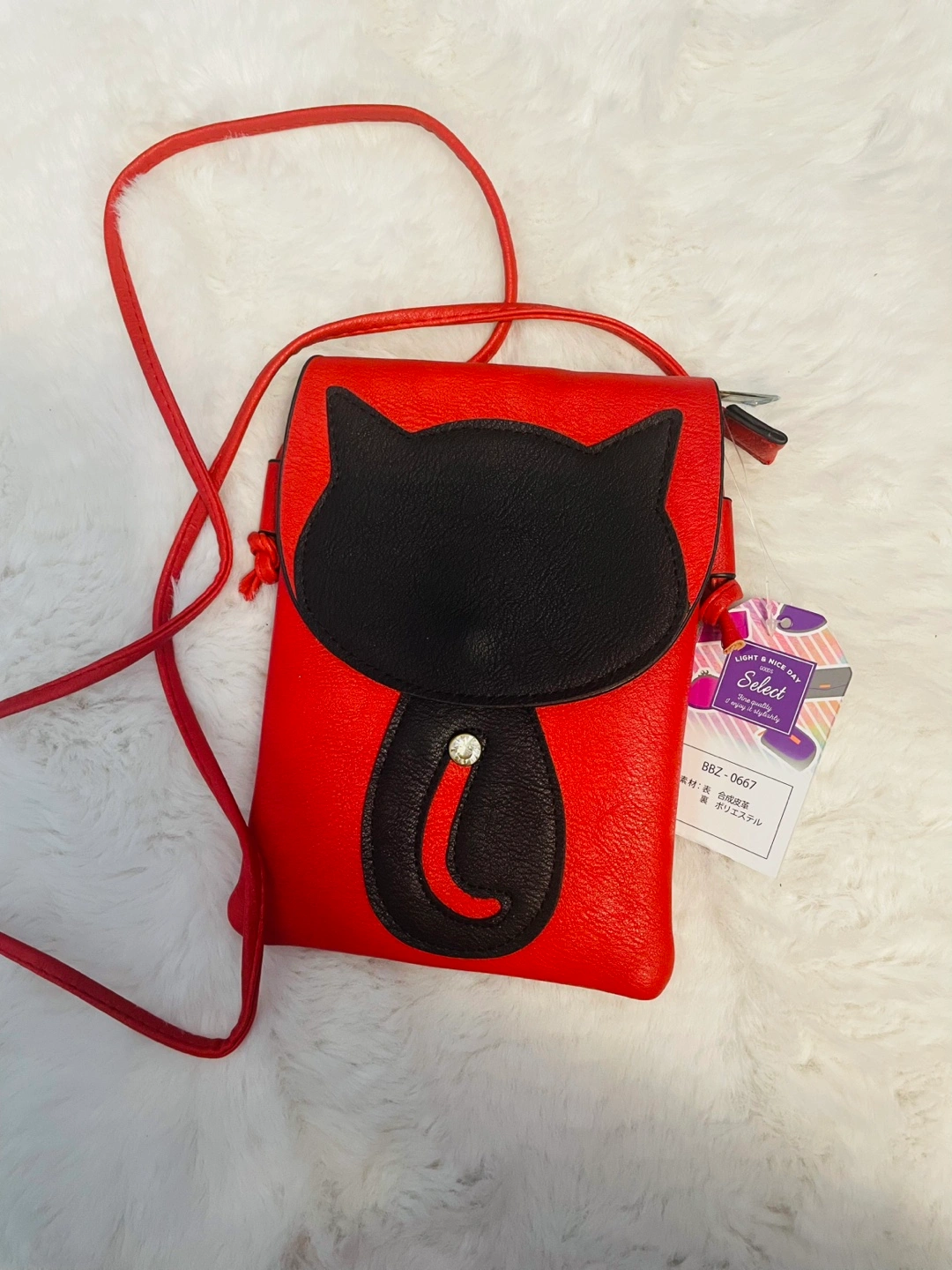 Small crossbody bag. Red faux leather. Features a cute black cat design. Adjustable strap. Zipper closure. Perfect for everyday use. Pick up Aurora/Newmarket/Markham Cash only.