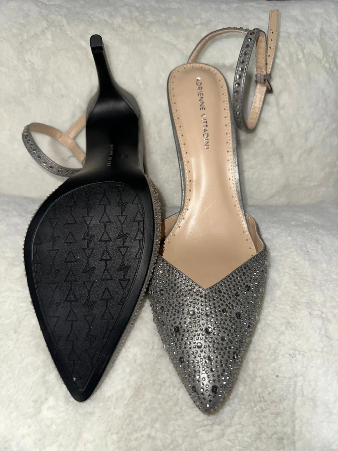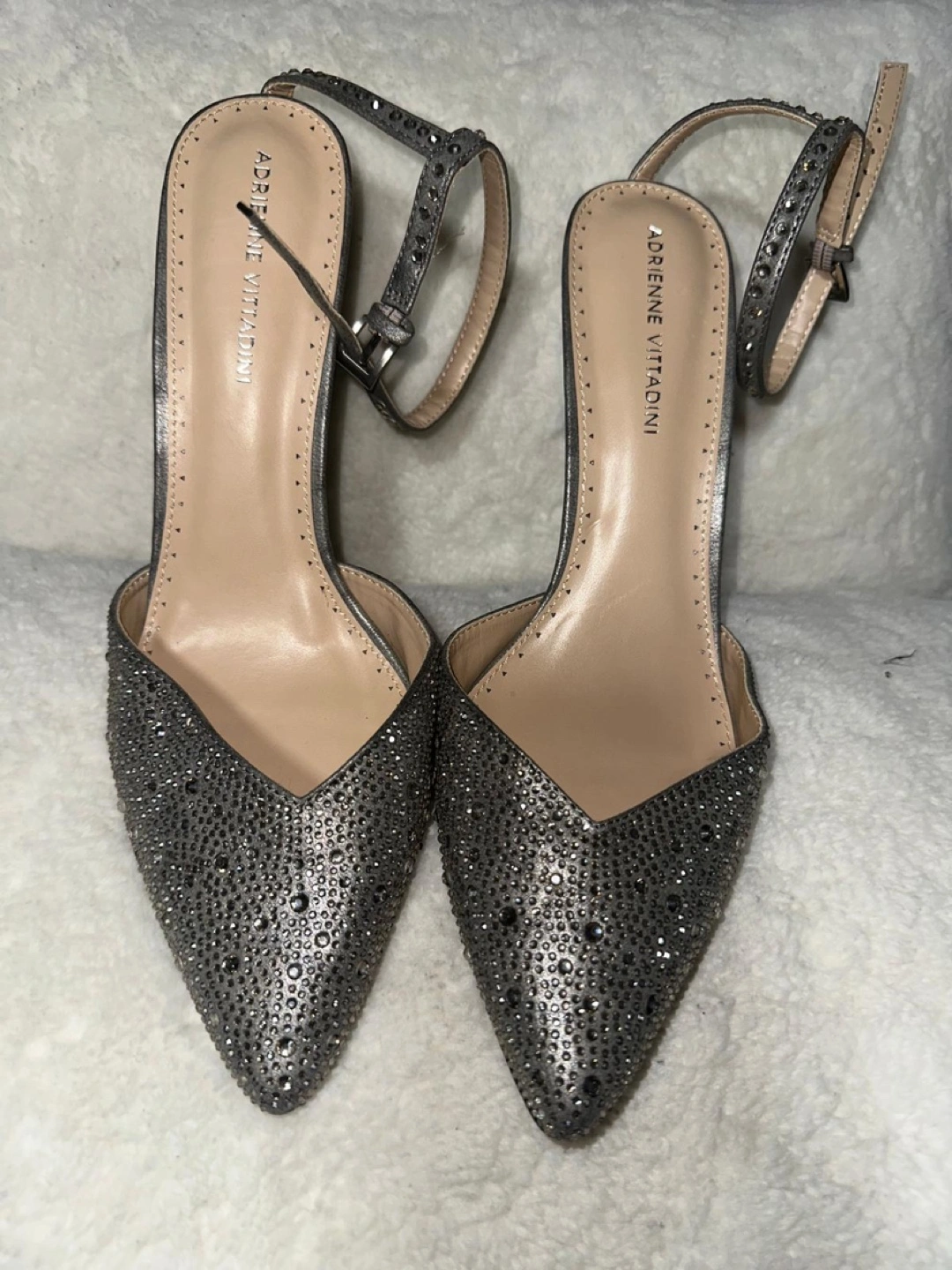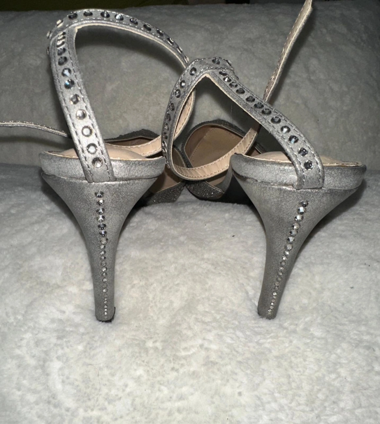 Beautiful grey rhinestone heels. Ankle strap closure. Low heel. Great for parties or special occasions.