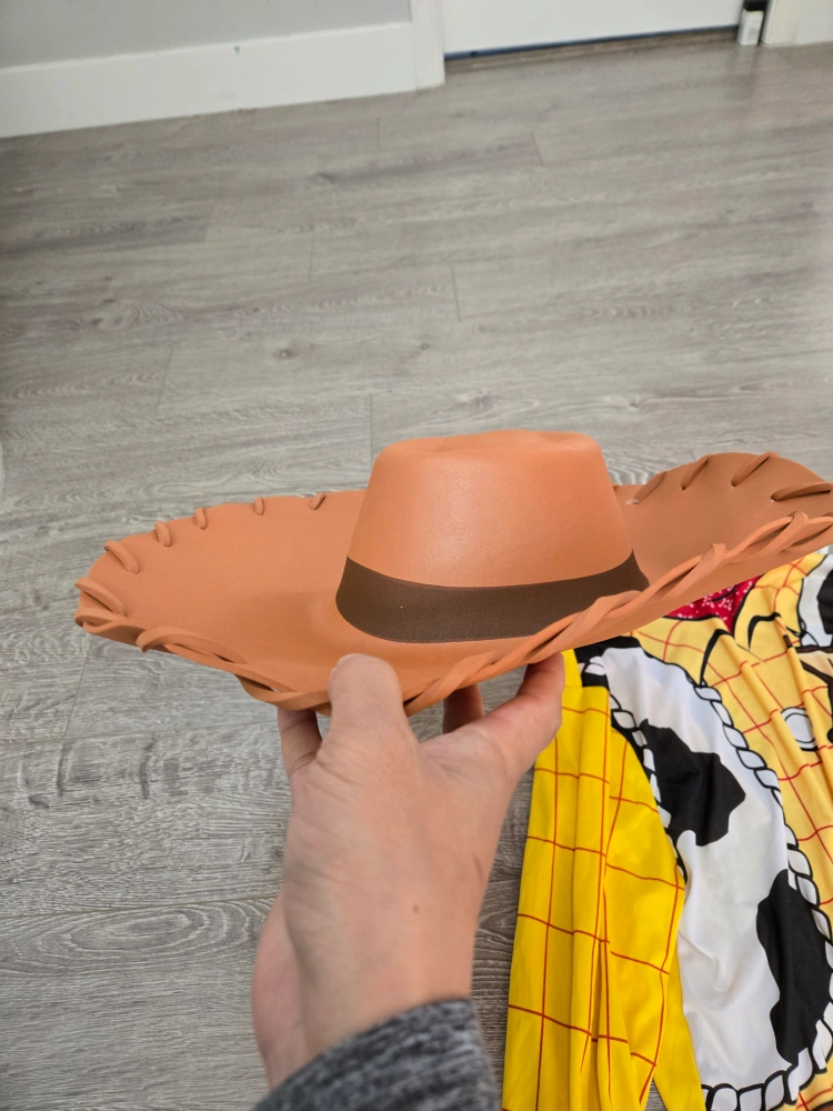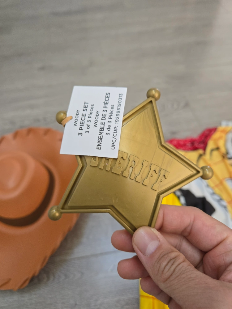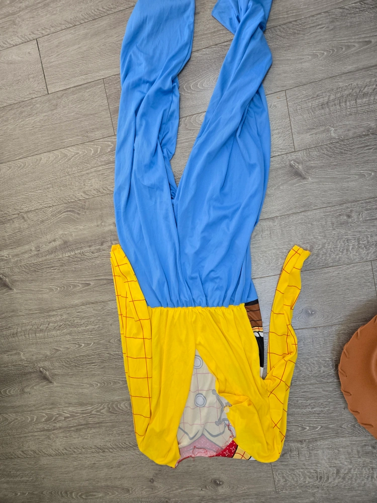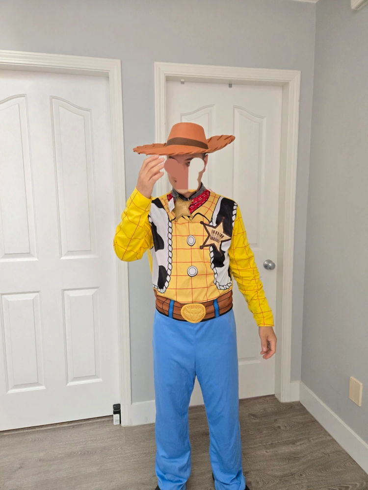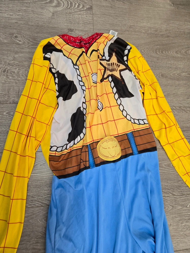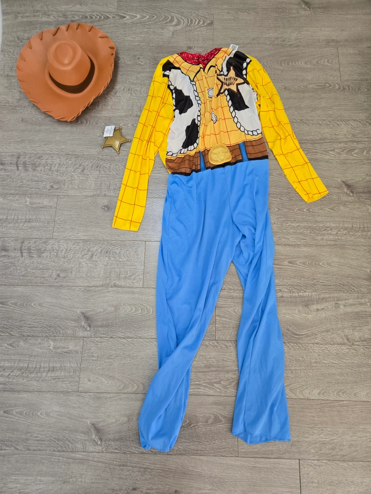 Adult costume toy story woody halloween costume w hat and sheriff badge One size Costume is in excellent condition. Its labeled as one size adult costume. Im 5 foot 7 and it fits me well. Also comes with brand new hat and badge. I purchased it new this year thinking I will use it. Plans changed. Price is firm Pick up near 22nd skytrain new west