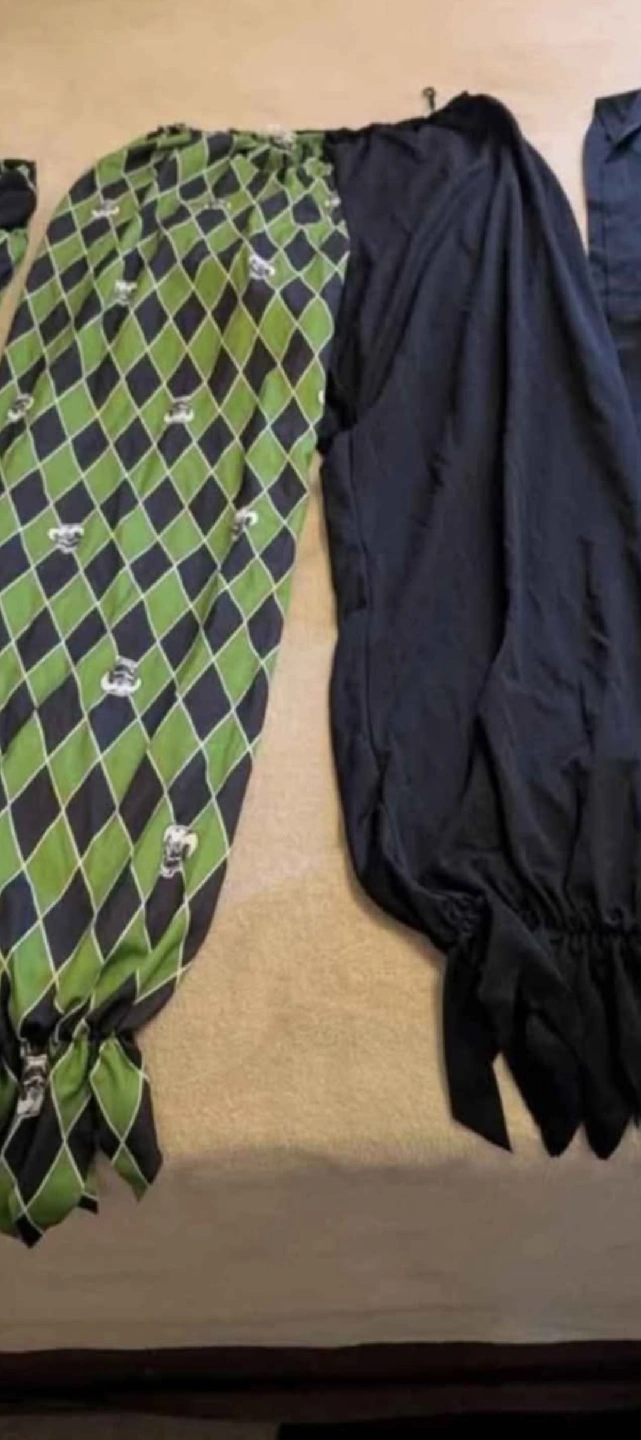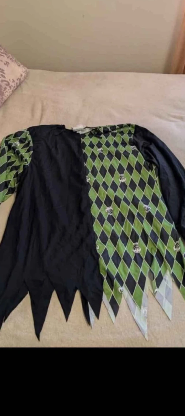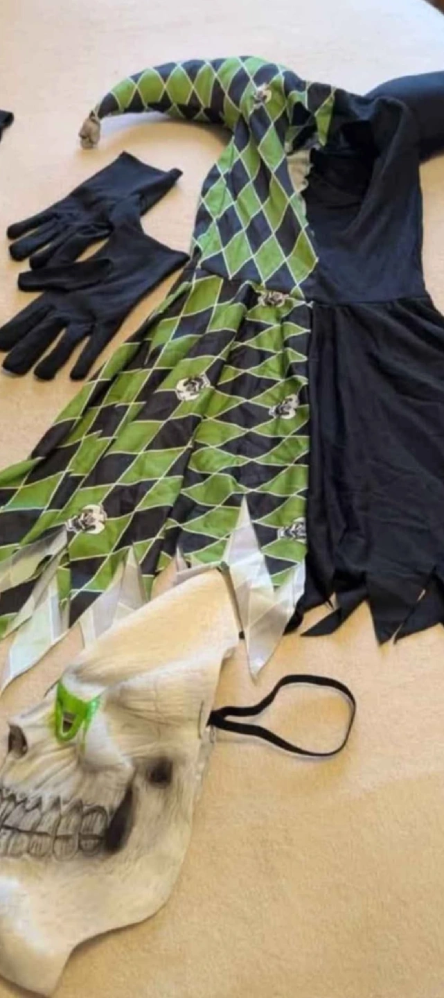 New $65 Get ready for Halloween with this fun jester costume! It features a green and black diamond pattern with skull designs, and includes a matching mask and gloves. Perfect for parties or trick-or-treating!
