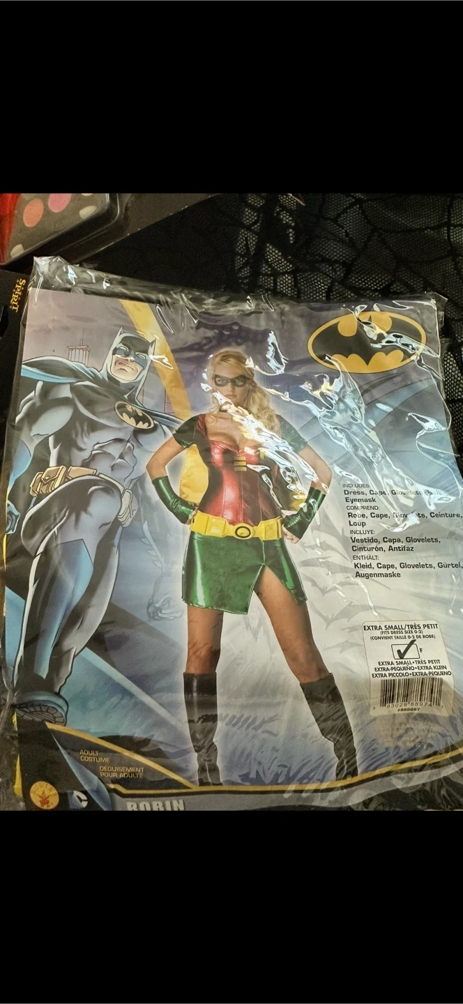 Selling an adult women's Robin costume from Party Shop! It includes the dress, cape, gloves, belt, and eye mask. Perfect for Halloween or cosplay. Size is extra small.
