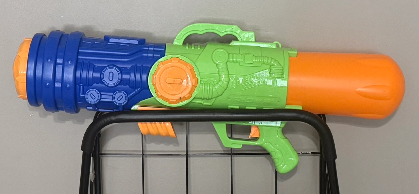 Large water blaster, great for summer fun. Features multiple colours and a large water tank. Pull the trigger to soak your friends!