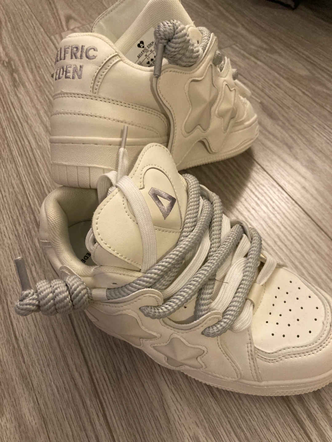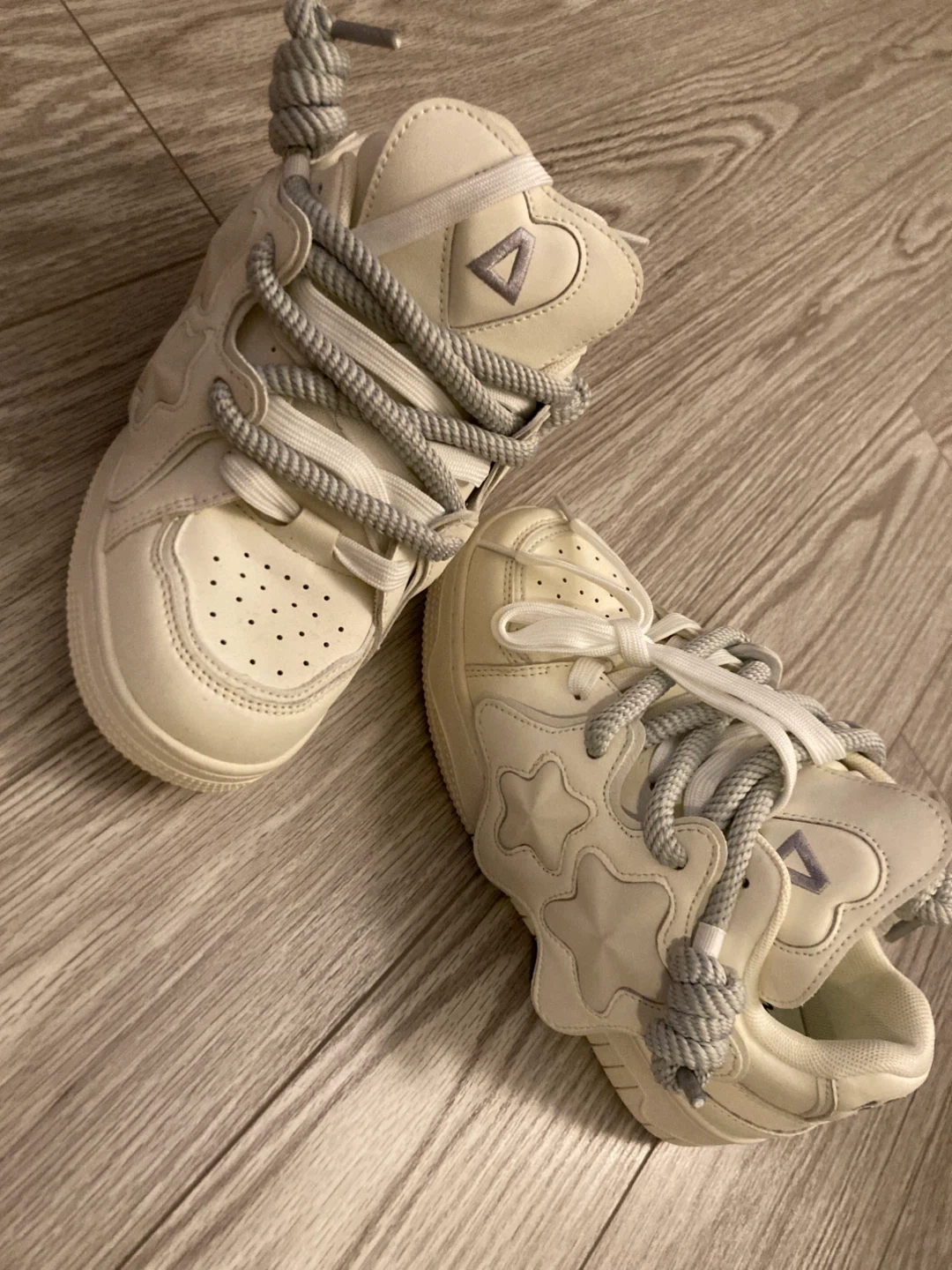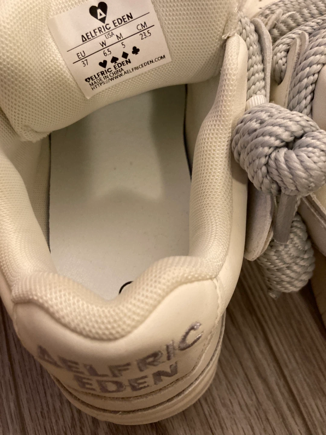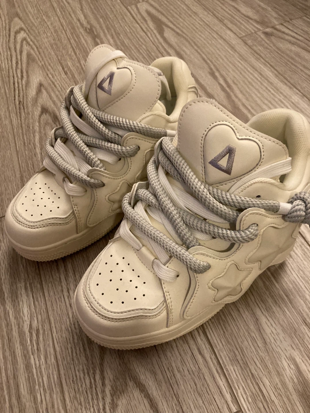 Selling a pair of Aelfric Eden sneakers in white! They're a women's size 6.5 (US). They feature a unique design with star and heart accents and chunky grey laces. Great for adding a bit of style to your everyday look!