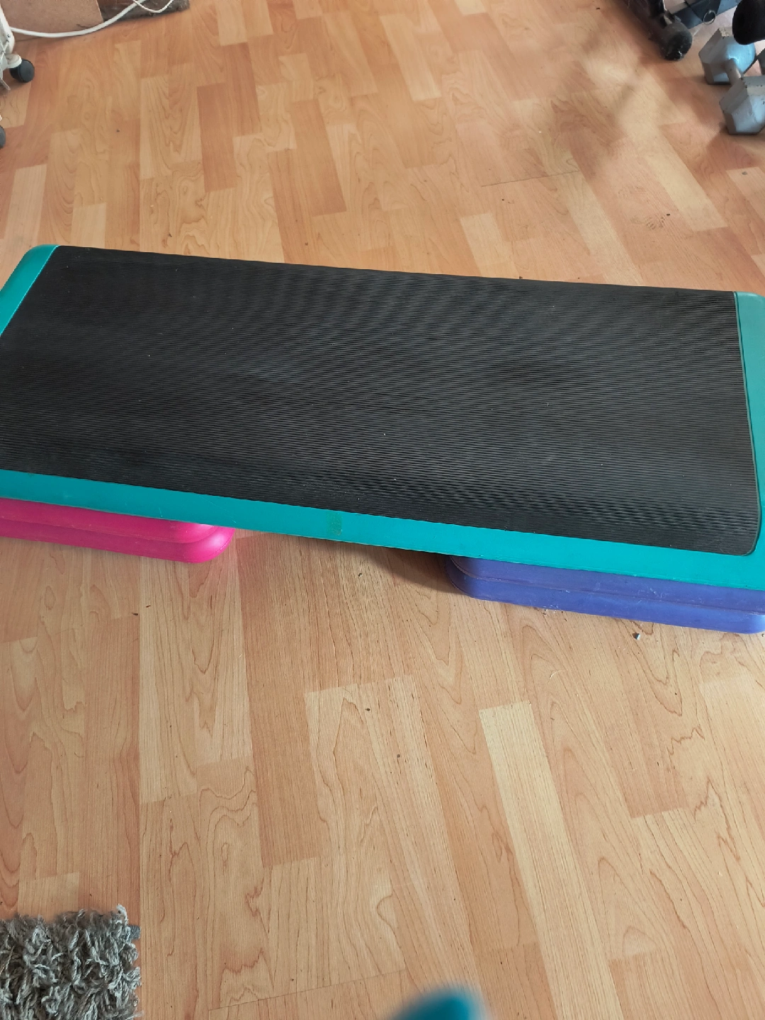 Selling an aerobic step platform in good condition! It's perfect for home workouts and adding some intensity to your routine. The platform has a black textured surface with teal edges, and it comes with pink and purple risers.