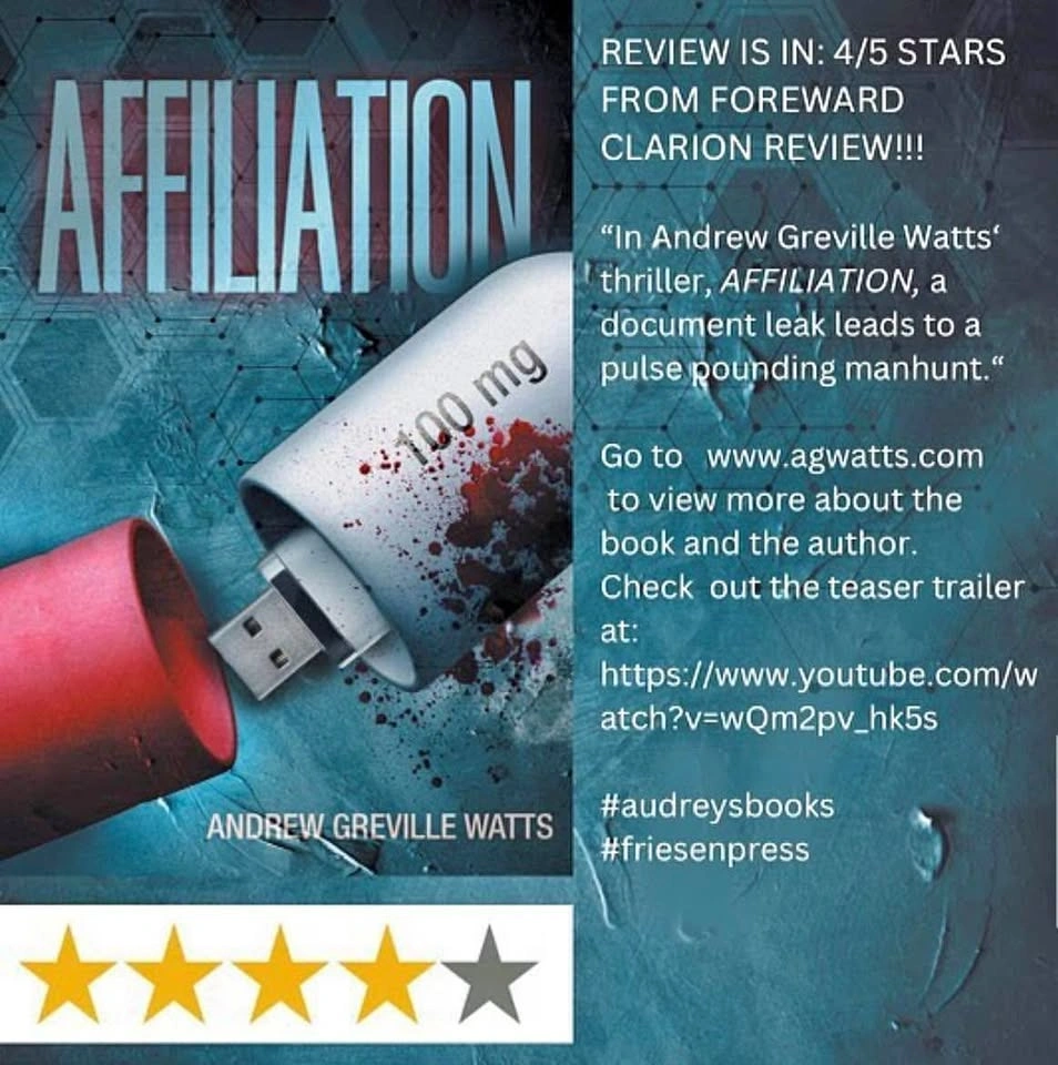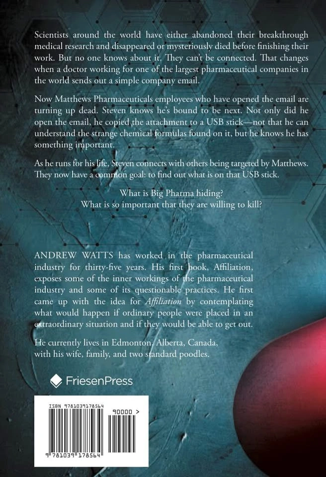 Message me to arrange local pick up of your own copy! My brilliant father-in-law has written a captivating novel that is a page turner from cover to cover. Support local! Check out the You Tube preview here: https://youtu.be/_sDhrwuU-mk IG: andrewgrevillewatts Web: www.agwatts.com Premise: Scientists around the world have either abandoned their breakthrough medical research and disappeared or mysteriously died before finishing their work. But no one knows about it. They can’t be connected. That changes when a doctor working for one of the largest pharmaceutical companies in the world sends out a simple company email. Now Matthews Pharmaceuticals employees who have opened the email are turning up dead. Steven knows he’s bound to be next. Not only did he open the email, he copied the attachment to a USB stick—not that he can understand the strange chemical formulas found on it, but he knows he has something important. As he runs for his life, Steven connects with others being targeted by Matthews. They now have a common goal: to find out what is on that USB stick. What is Big Pharma hiding? What is so important that they are willing to kill?