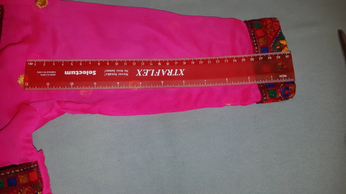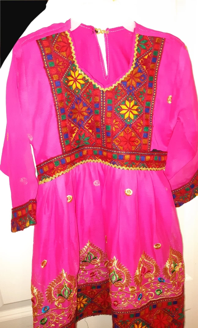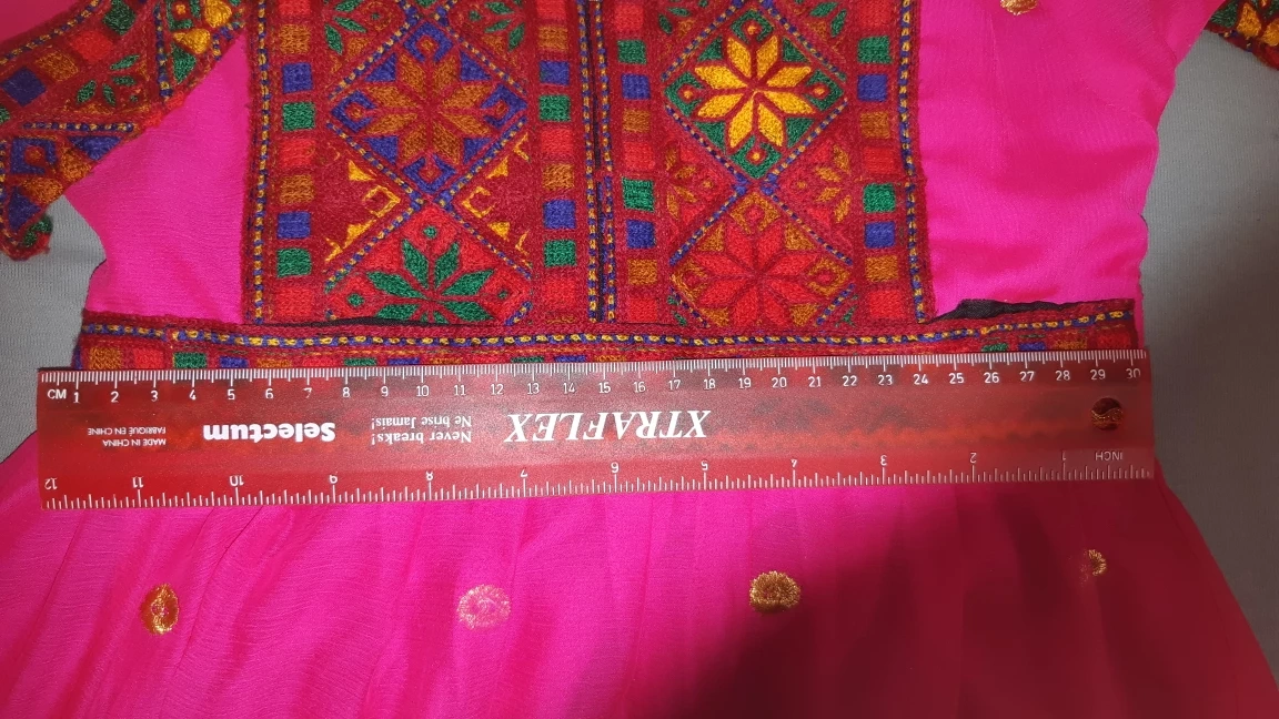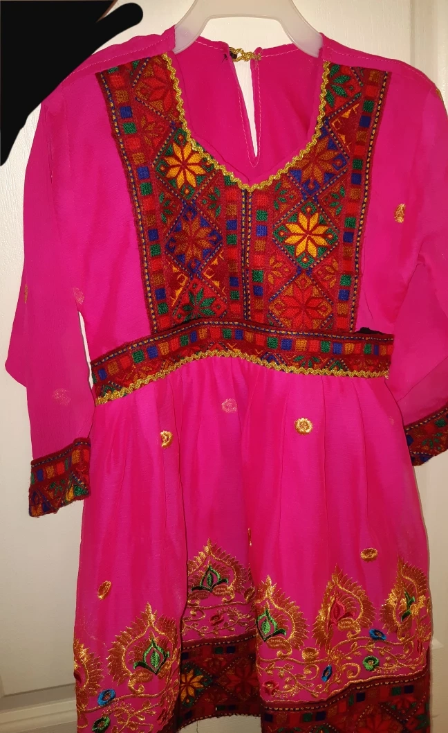 For young girls, measurements are in CM in photos. Gently used. Small damage on the back due to the light fabric material. It's a very soft dress and is lined. Thread stitching design on chest, bottom, and wrists.