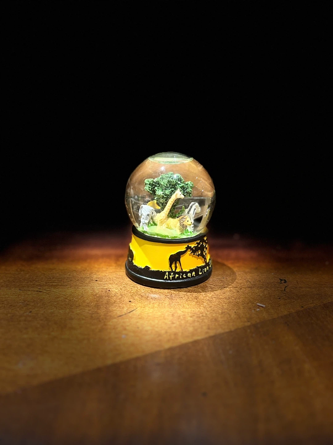 Here's a cute snow globe featuring African Lion designs around the base and a miniature African scene inside the globe! It's a fun little piece to add some whimsy to your space
