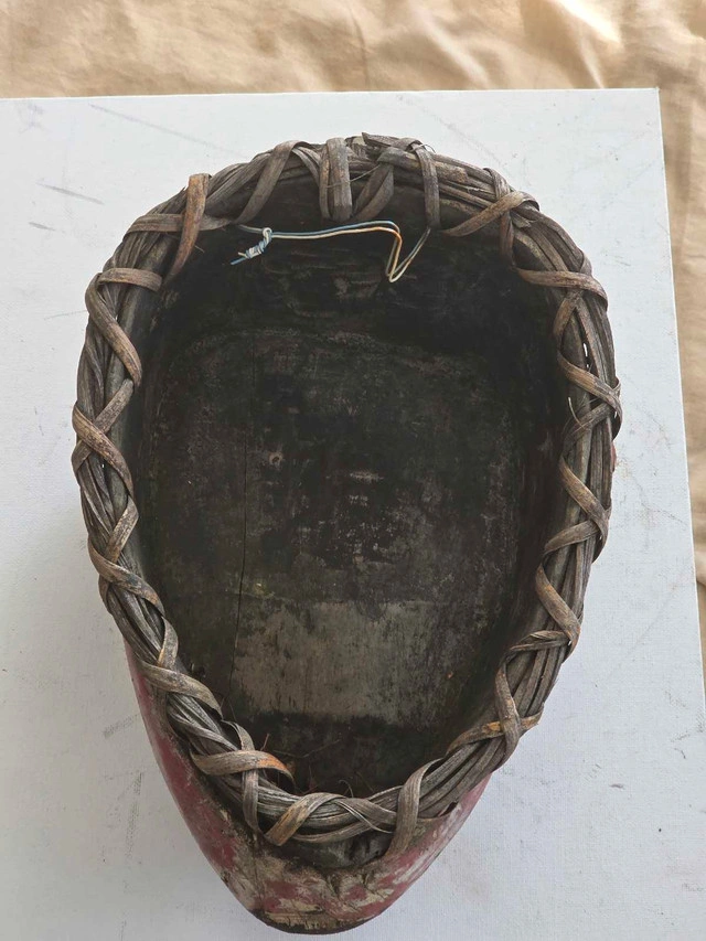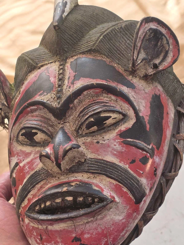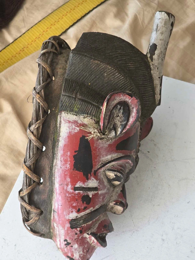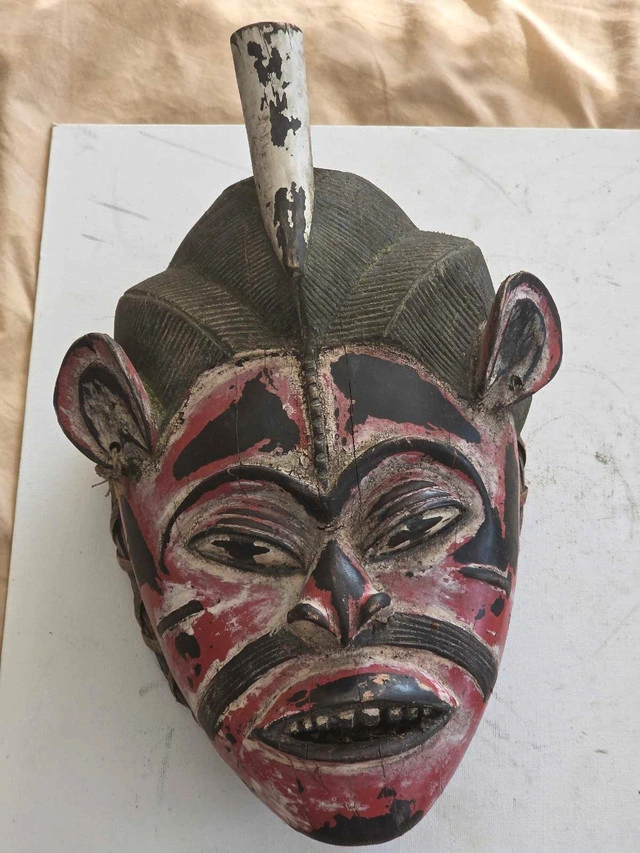 This unique, hand-carved African mask showcases traditional craftsmanship with its detailed tribal design, bold red and black accents, and a distinctive weathered texture that tells a story of its age and journey. This preowned mask is in good condition considering its age, with wear that enhances its authentic character. Specifications: - Material: Wood, possibly sourced locally in Africa - Colour: Red, Black, and White - Dimensions: Approximately 13 1/2 inches in height,9 8 inches in width - Origin: Africa - Condition: Used, with visible signs of wear consistent with age This African Mask makes a fantastic addition to any decor. Its history-rich patina and time-worn elegance will certainly bring an exotic vibe to your home!