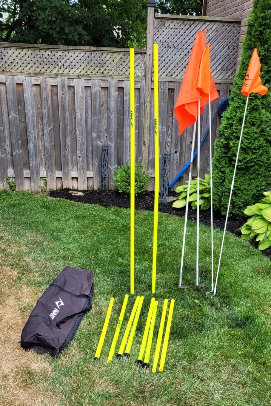 65 inches assembled 6 agility poles and 4 corners flags. Comes with a carring bag. All in great shape Pick up at Whites and Strouds ln area