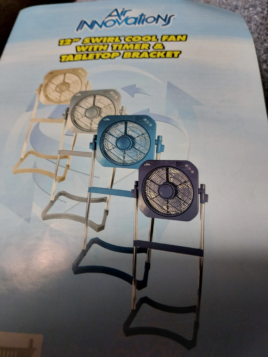 Looking to keep cool? I'm selling an Air Innovations 12" Swirl Cool Fan with Tabletop Bracket! It features Swirl Cool oscillation technology to circulate air throughout the entire room. Bought from the Shopping Channel. adjustable height. Can be used as a tabletop. speeds low, medium & high. 7 hour timer feature to turn off in 1 hour increments. Excellent condition...like new. Booklet included. 20" long x 15" w x 42" h. Cash only.