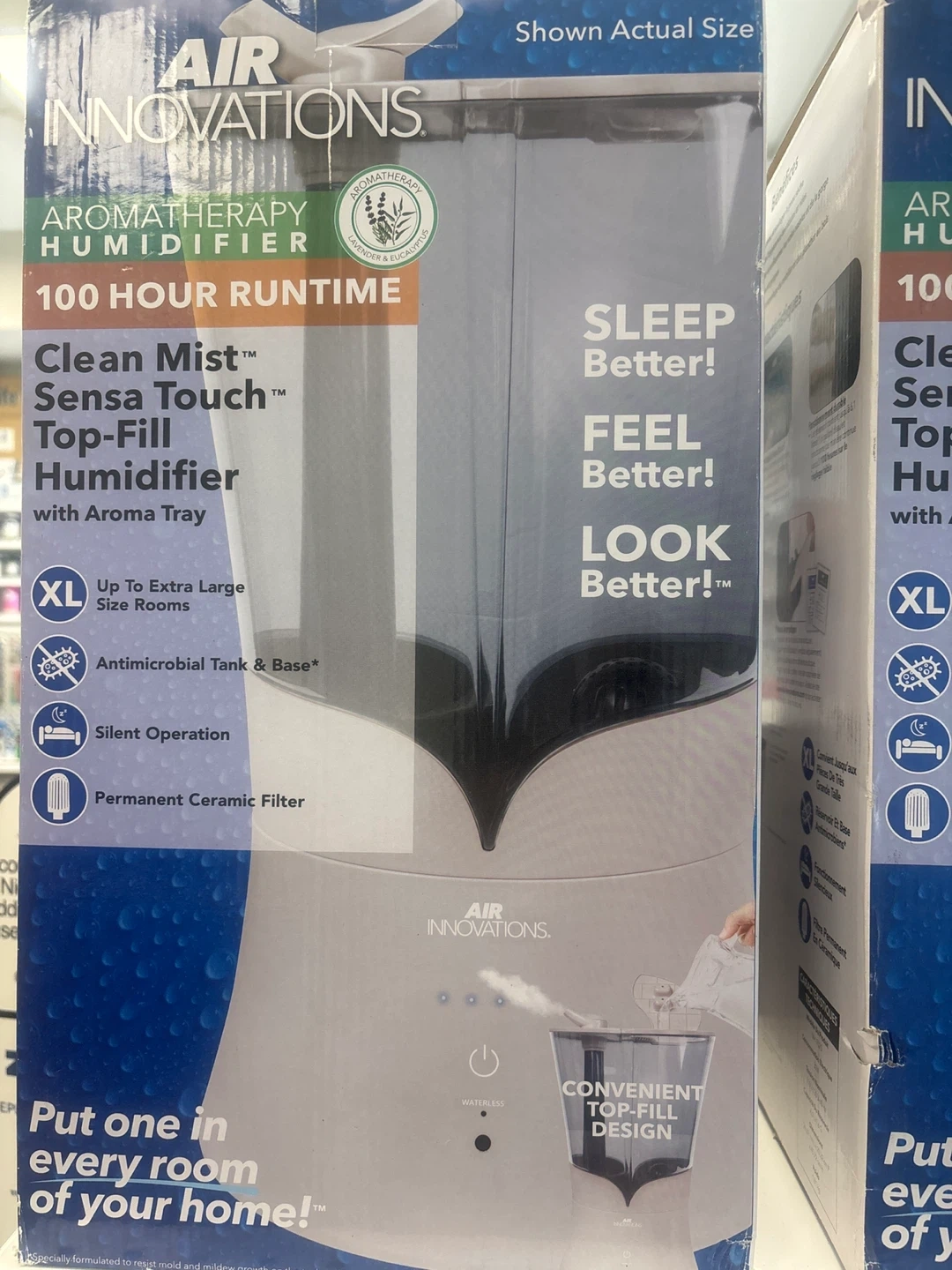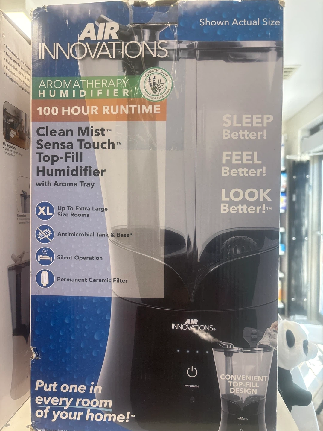 I'm selling an Air Innovations aromatherapy humidifier. It features a clean mist sensa touch top-fill design with an aroma tray. It's suitable for up to extra-large size rooms. It also has an antimicrobial tank and base, silent operation, and a permanent ceramic filter. The box is included!