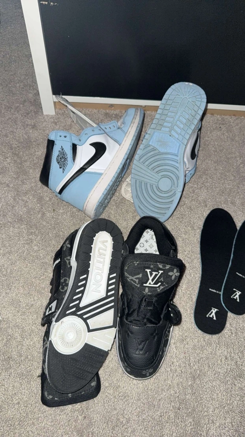 Selling a pair of Air Jordan 1 High University Blue sneakers and a pair of Louis Vuitton sneakers. Both show signs of wear but are still in good condition. Comes with insoles.