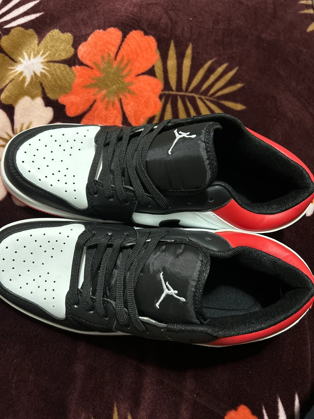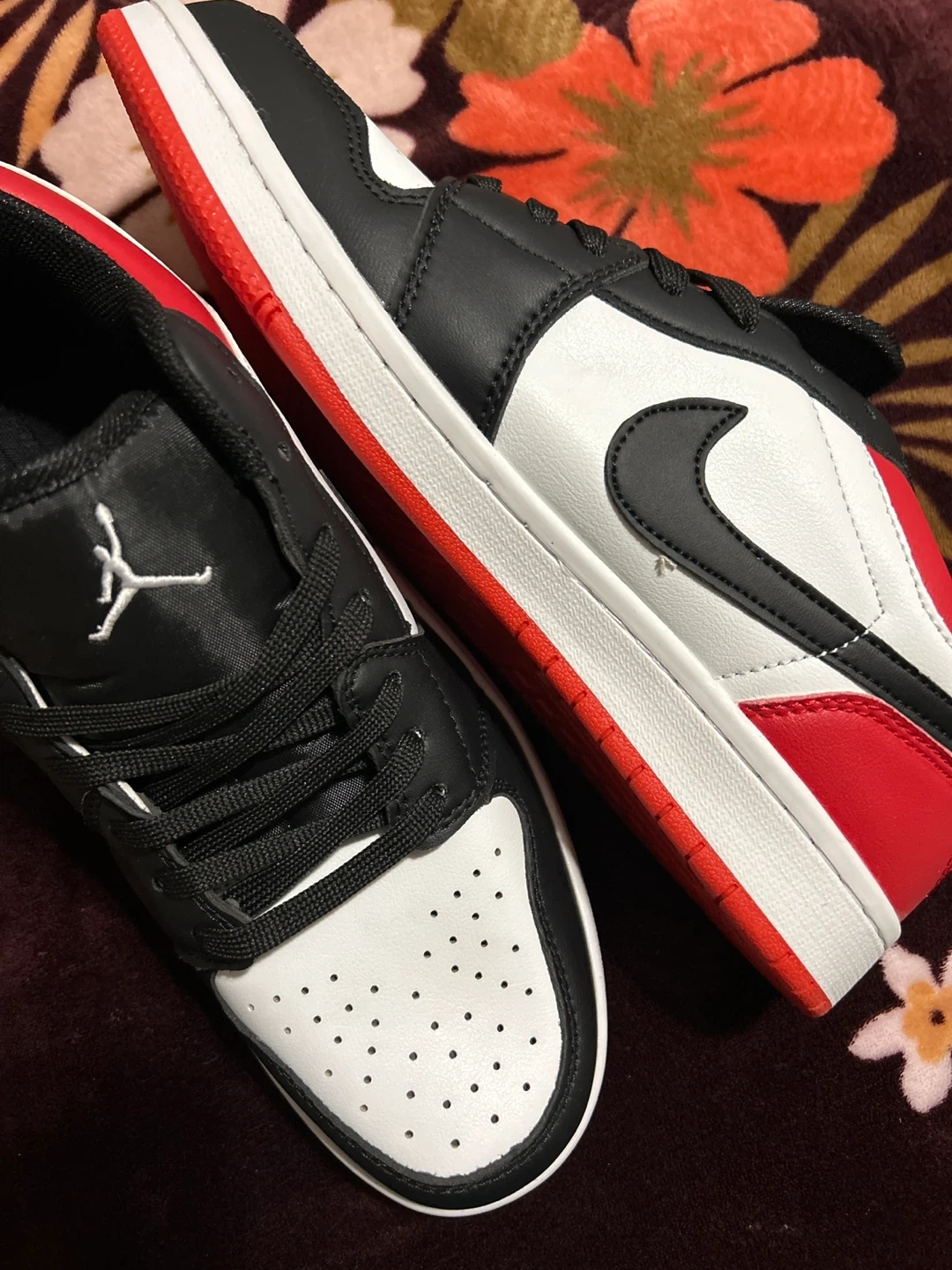 Selling a pair of Air Jordan 1 Lows in a classic black, white, and red colourway. These are stylish and comfortable for everyday wear!