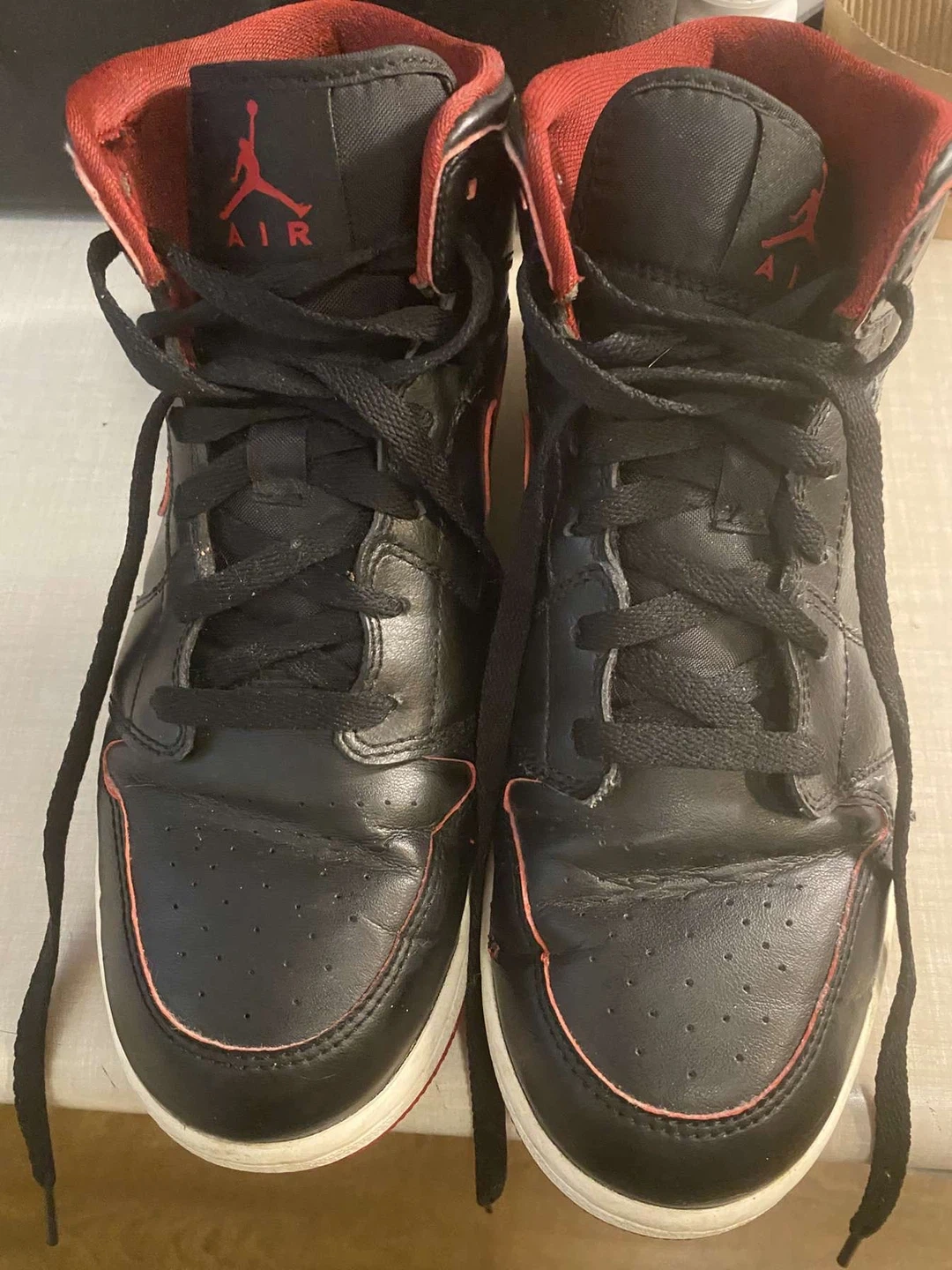 Jordan Air 1 Mid shoes in a Youth size 6.5. These iconic high-tops feature a sleek black and red colourway, perfect for making a statement on the court or the streets. Only worn 3-4x and they still have plenty of life left and are ready for new adventures. Here are some additional details: * Brand: Jordan * Model: Air 1 Mid * Color: Black/Red * Style: High-top * Size: Youth 6.5 These stylish sneakers are priced to sell at $60. Don't miss the chance to add these iconic kicks to your collection. If the ad is up, they're available—no need to ask!