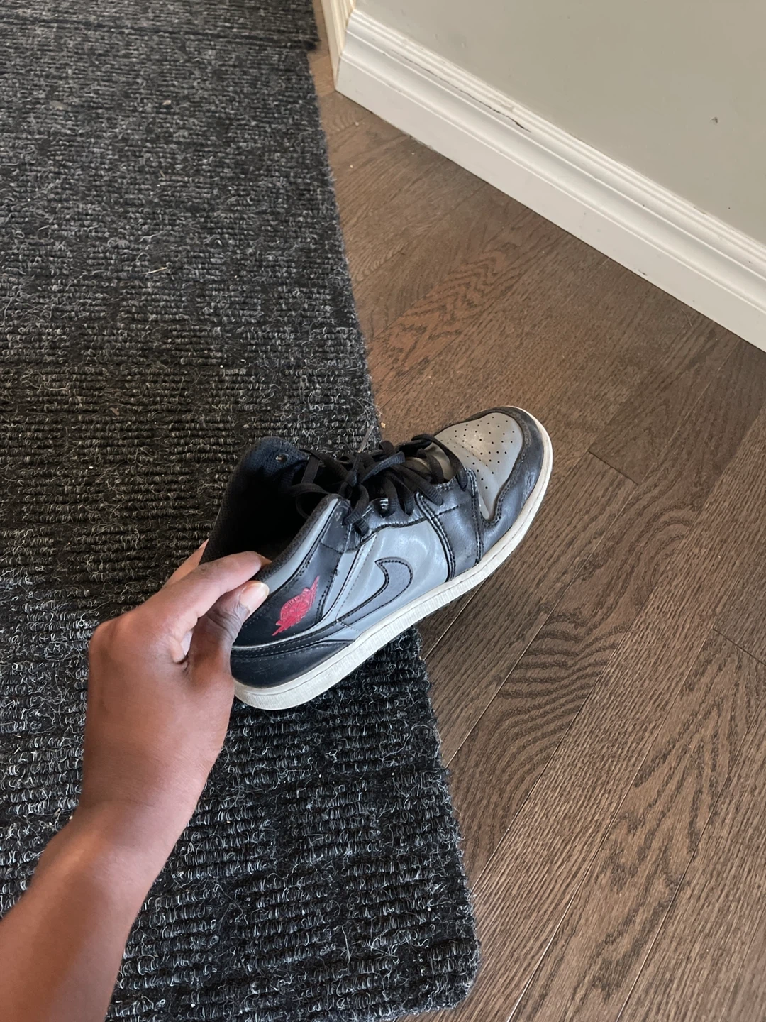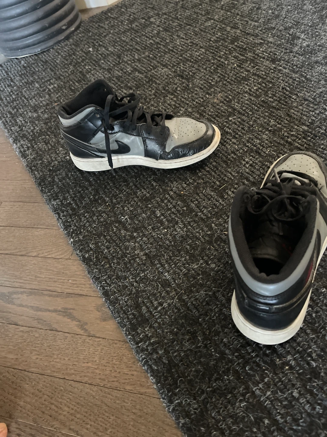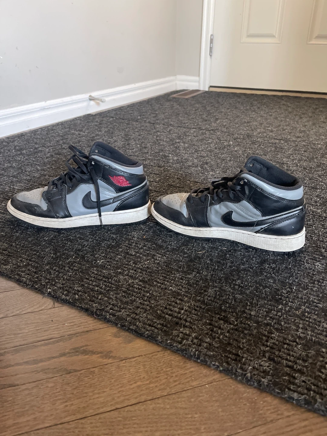 Air Jordan 1 Mid shoes in grey and black, in good condition. These are a stylish and comfortable pair of sneakers for everyday wear!