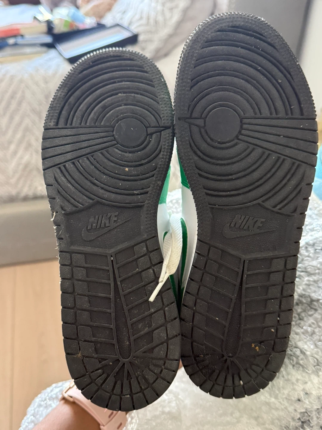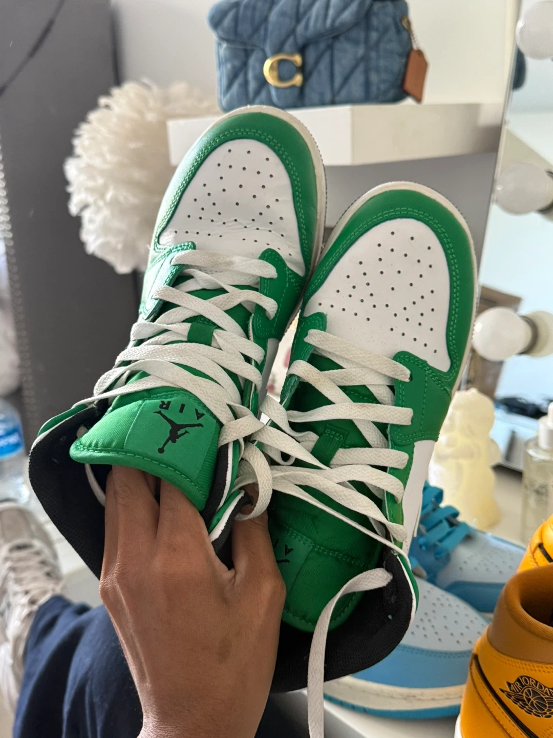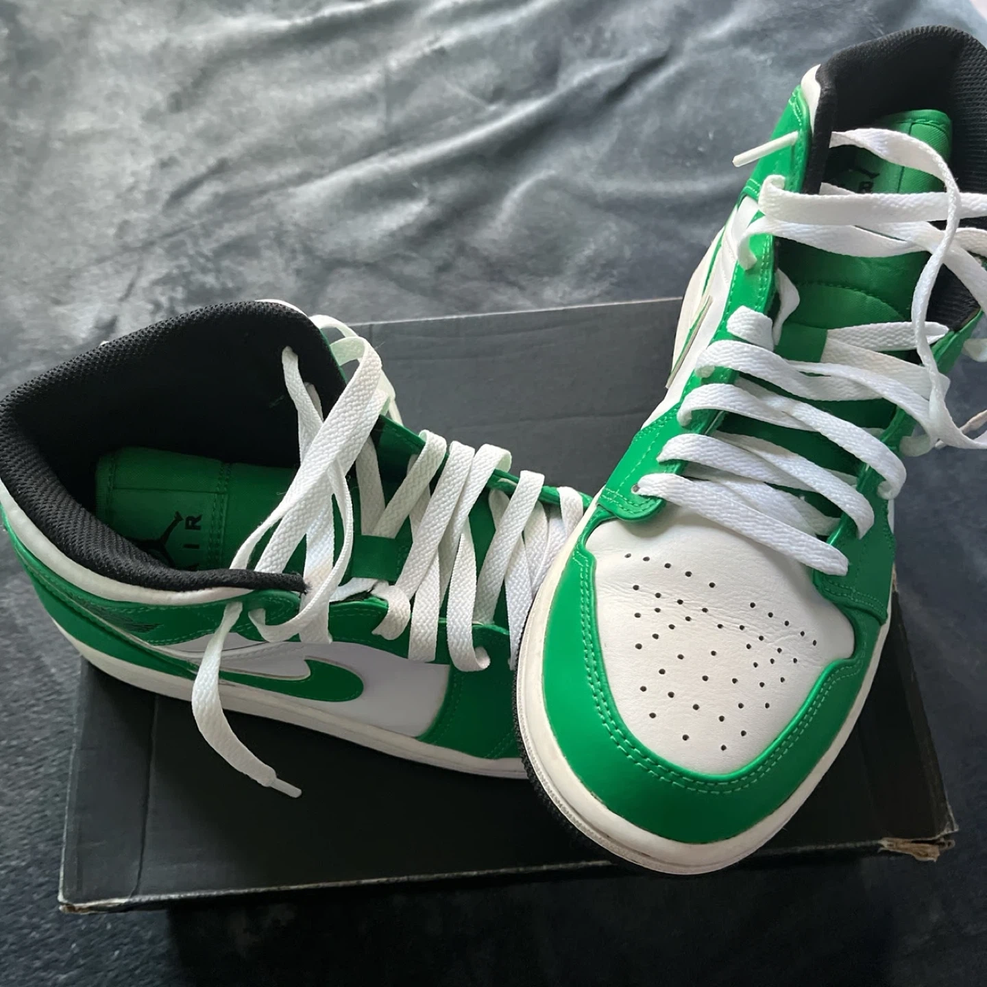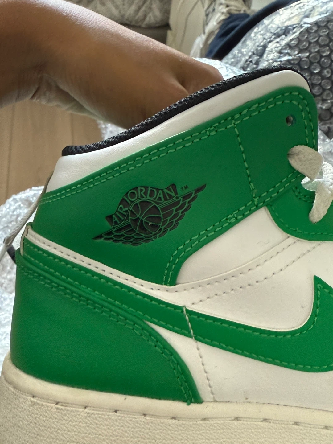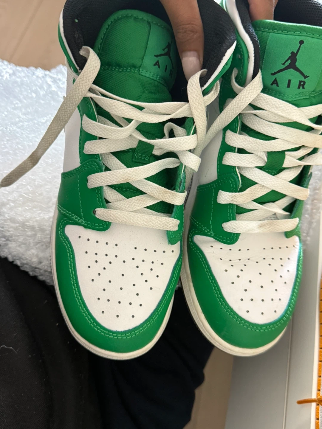 Selling a pair of Air Jordan 1 Mid in Lucky Green, a classic and stylish sneaker! The shoes feature a white and green colourway, perfect for adding a pop of colour to any outfit. They are in great condition and ready for a new home