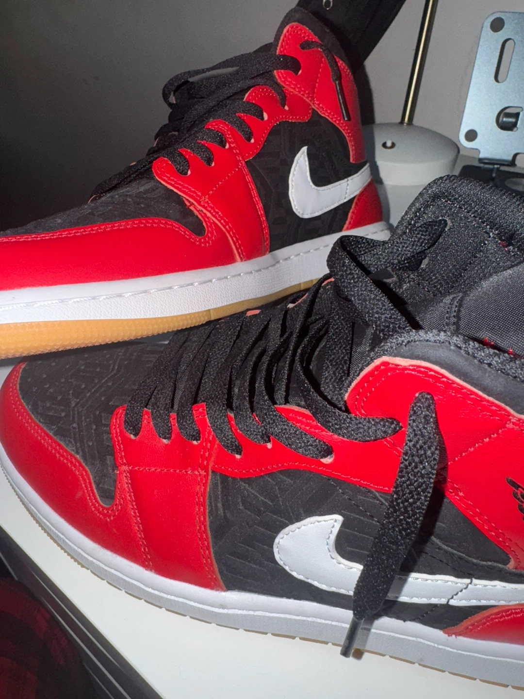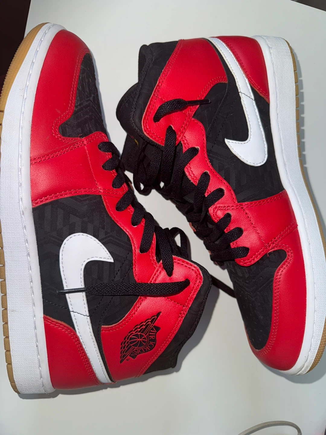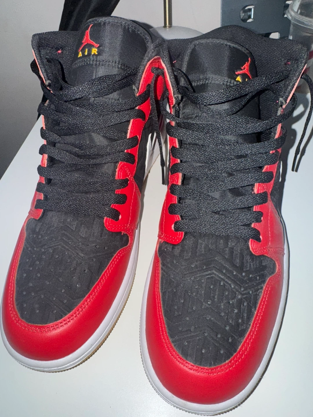 Selling a pair of Air Jordan 1 Mid SE sneakers in the Black/Fire Red-White-Malachite colourway. They are a US size 10.5. Comes with the original box and an extra pair of green laces!