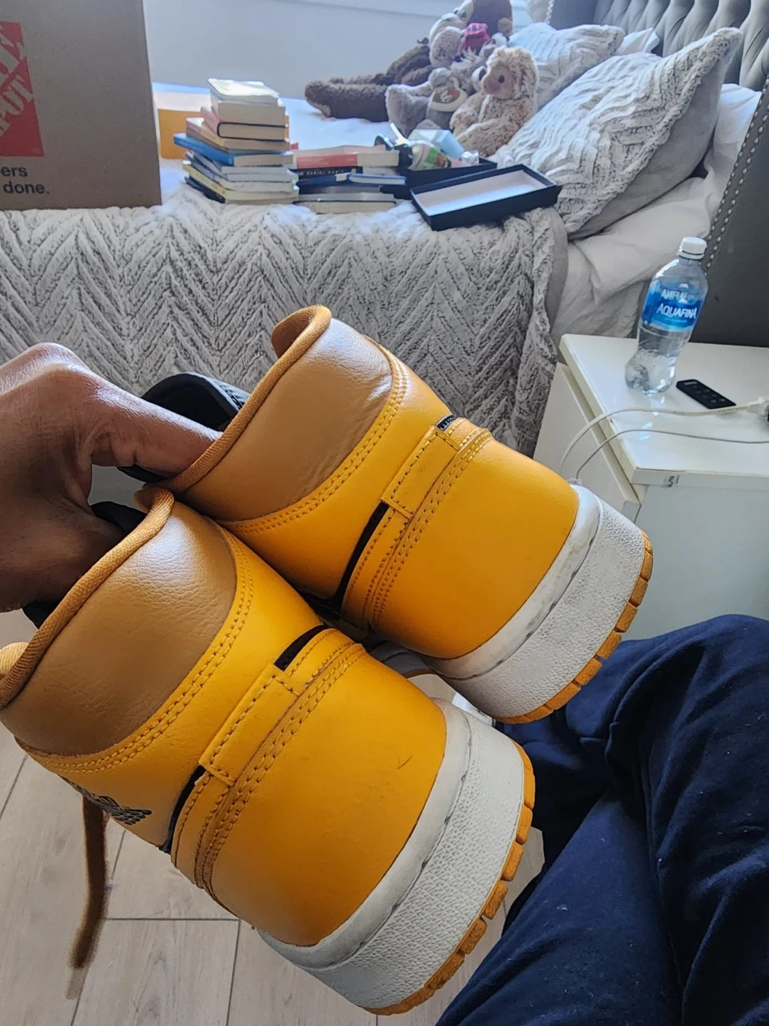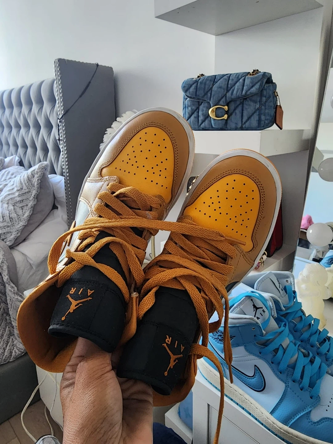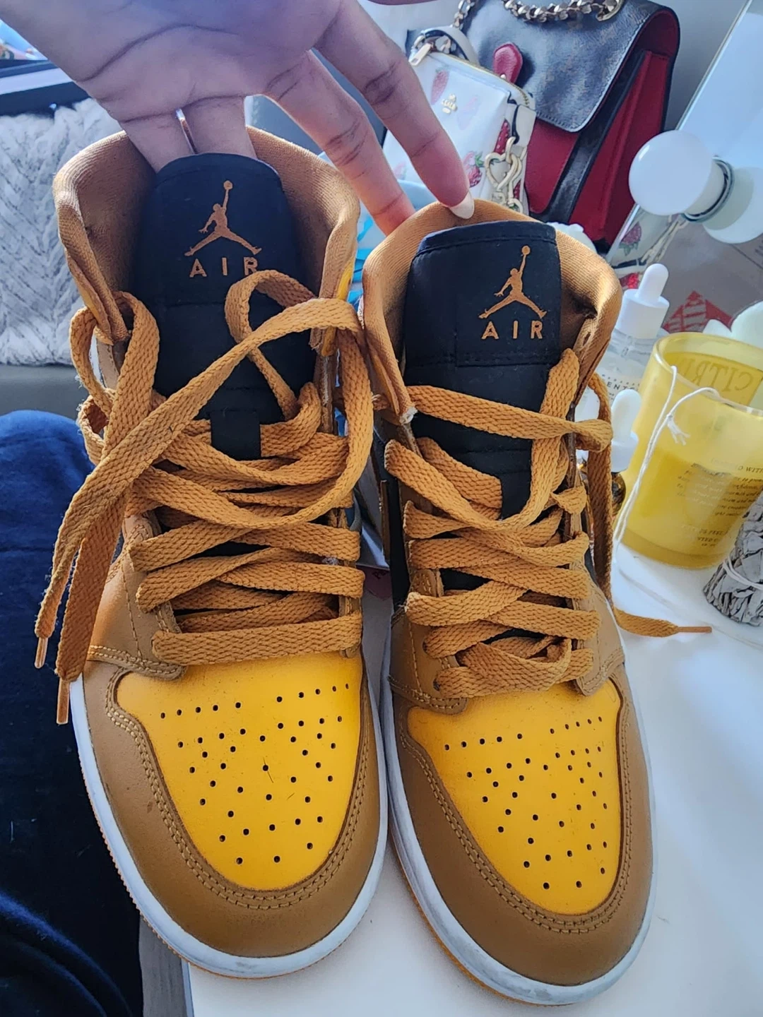 Selling a pair of Air Jordan 1 Mid SE sneakers in the "Laser Orange" colourway! These are in great condition and ready for a new home. They feature a stylish combination of yellow and black, perfect for adding a pop of colour to your outfit. Comfortable and iconic, these Jordans are a must-have for any sneakerhead