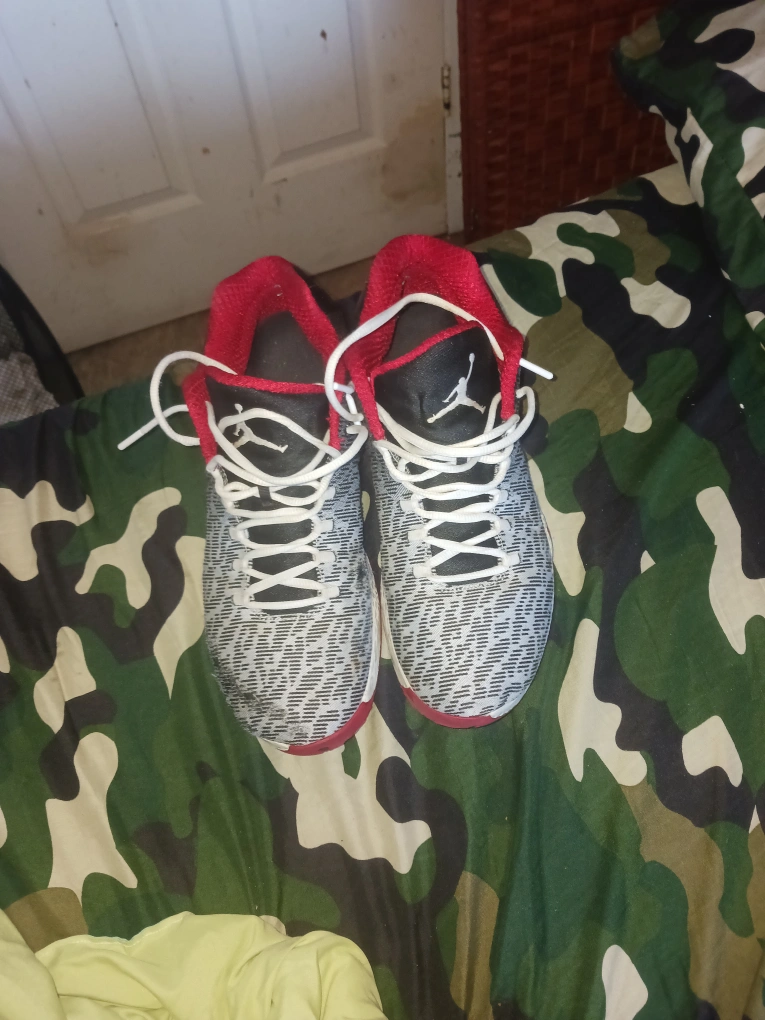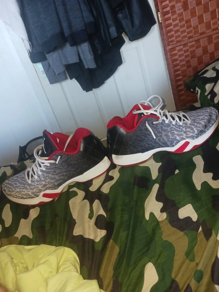 Selling a pair of Air Jordan 29 Low basketball shoes. They feature a grey and black patterned upper with red accents on the lining and sole. Great for playing ball or casual wear!